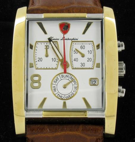 Brand New Tonino Lamborghini men's stylish sport chrono style tank shaped watch in excellent new condition; with date, day and dual seconds dials; 18k clad stainless case and leather band; box and papers; retail $2495