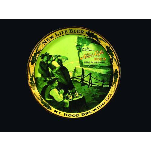 New Life Beer Tin Serving Tray, Mt. Hood Brewing Co., Oregon, a few blemishes around the rim otherwise excellent condition 12 inch diameter.
