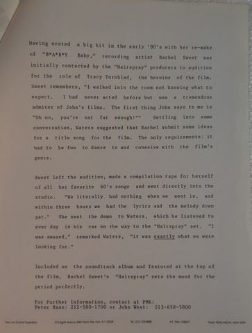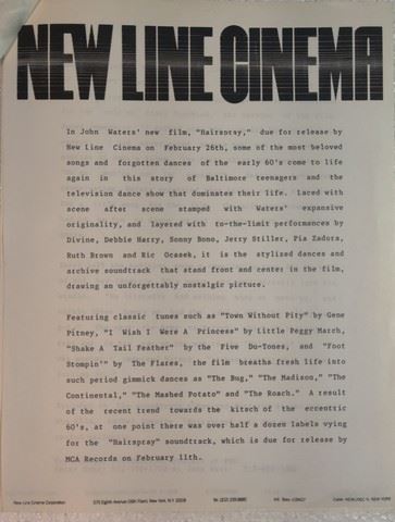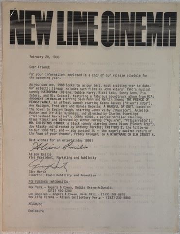 Release Schedule (New Line Cinema, 1988) release schedule. Document released by Alison Emilio, VP of Marketing and Publicity, and Gary Hertz, Director of Field Publicity and Promotion. Listed on the first page are Hairspray, The Prince of Pennsylvania, A Handful of Dust, Cobra Verde, Mr. Christmas Dinner, and A Nightmare on Elm Street 4. The document only contains the first three pages with details of "Hairspray" only. (8.5"11").