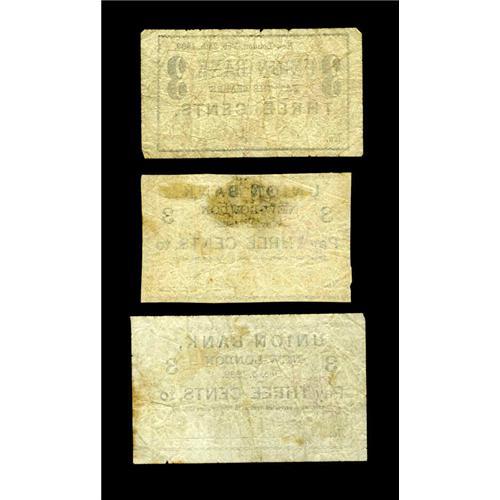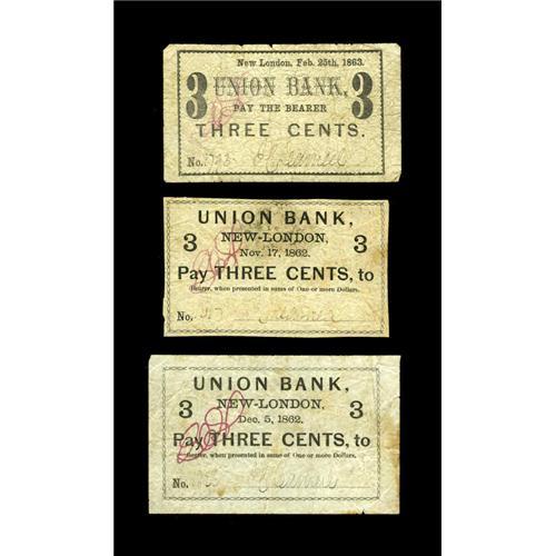<B>New London, CT- J. C. Learned</B></I> 3¢ (3) Nov. 17, 1862, Dec. 5, 1862, Feb. 25, 1862<BR>Three different pieces of 3¢ scrip from this merchant, who was also active in New London politics, having been a city commissioner as well as serving as an officer in one of New London's first water companies. The first two notes are similar in form, the last bears a revised design. All grade <B>Fine</B></I> or better.