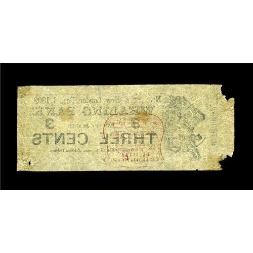 <B>New London, CT- Samuel Hobron</B></I> 3¢ Dec. 1, 1862<BR>An excessively rare piece of scrip not only from this issuer but also from the Whaling Bank as well, which has only a handful of scrip notes of any kind reported. <B>Very Good,</B></I> with a couple of corners gone from the wide left margin.
