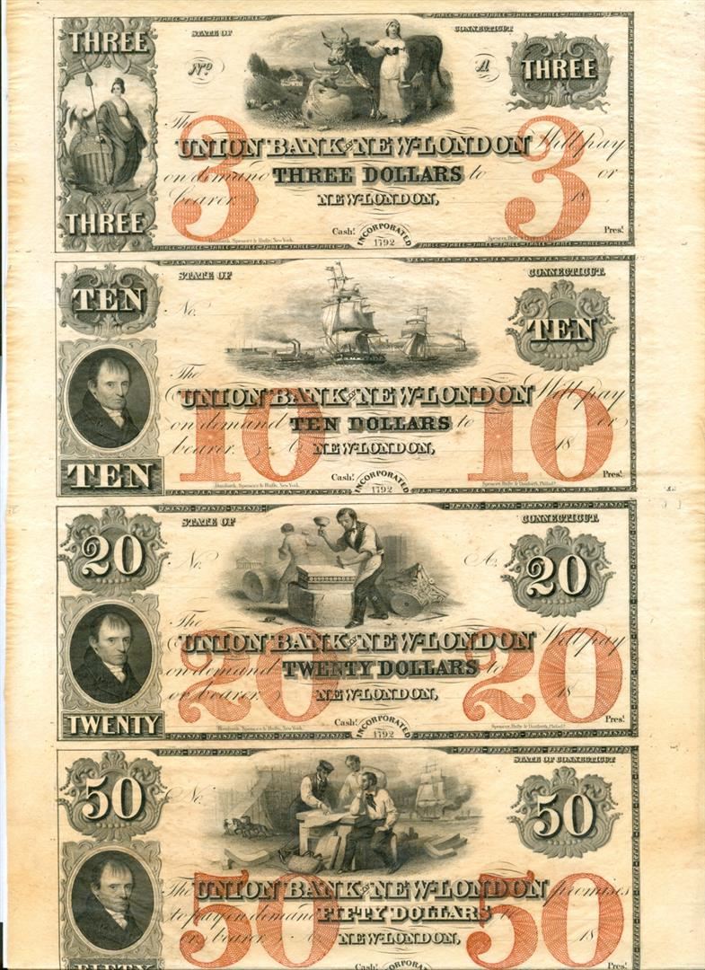 4 Different Types of Notes Uncut from New-London, Connecticut. The Union Bank in New-London $3,$10,$20, and $50 Notes.