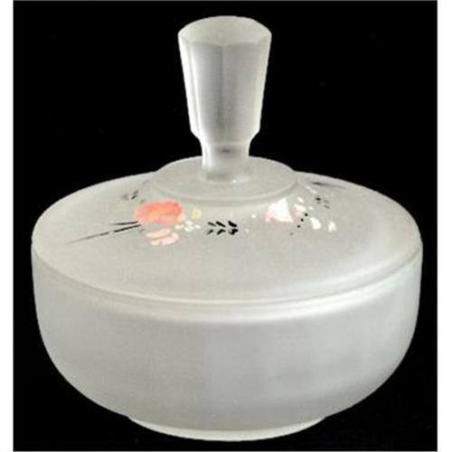 This lovely satin or frosted Depression glass powder jar has hand painted floral decorations and measures 4 1/4" tall x 3 3/4" across. Produced by the New Martinsville Glass Co. during the 1930s as part of a dresser set. The two matching perfume bottles are for sale in separate auctions. With the exception of slightly worn paint this lovely satin glass powder jar is in excellent condition