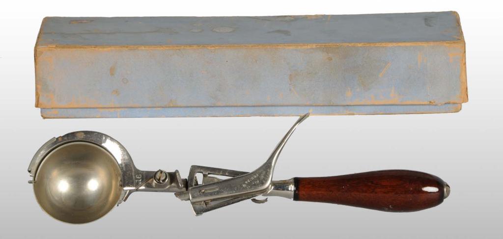 Description 1910 to 1920. Scoop has an automatic leveling mechanism that cuts across the top. Nice condition with only minimal wear. Includes instructions. Condition (8.5 - 9.0, Excellent - Near Mint). Size 11" L.