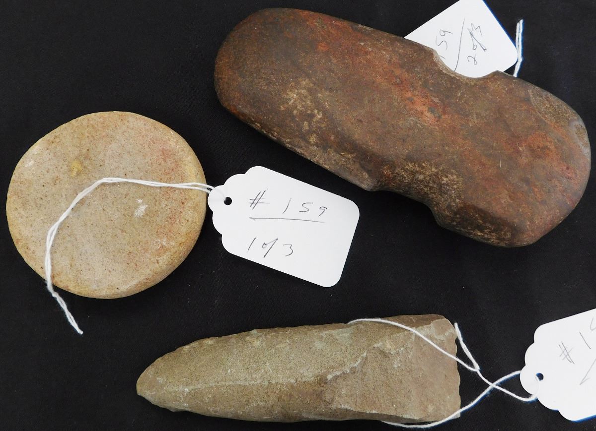 This collection consist of Axe measuring 7 x 3 inches, adze measuring 5 x 2 and discoidal 3 x 1 inches. Items are from Santa Fe New Mexico. The adze is chipped on bit. The axe and discoidal are in fine condition. See images. Shipping: $30