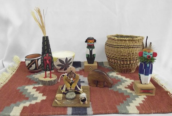 New Mexico Collectibles. Chimayo Rug measures 21'' x 15''; a Santo Domingo pot with life line measures 2.25''H x 2.5'' diameter; an Isleta Pueblo Pot 2.5''H x 3'' diameter; 2 Hopi Kachinas with secret door bases and with hooks for hanging, 5''H;Navajo folk art bird 9.5''H; a woven basket over a planter 5'' H; a wooden bear fetish with heart line standing 2''H. Finally a Navajo doll grinding corn with cradleboard baby.