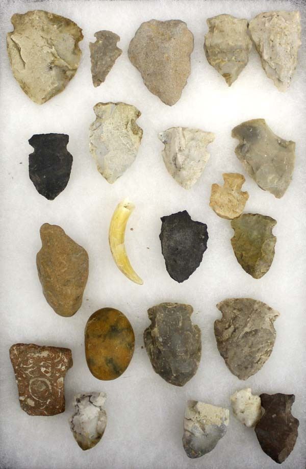 New Mexico Estate Stone Arrowheads Plus, longest point measures 2 3/8''L, also includes a burnishing stone, rocks, and a mammal's tooth