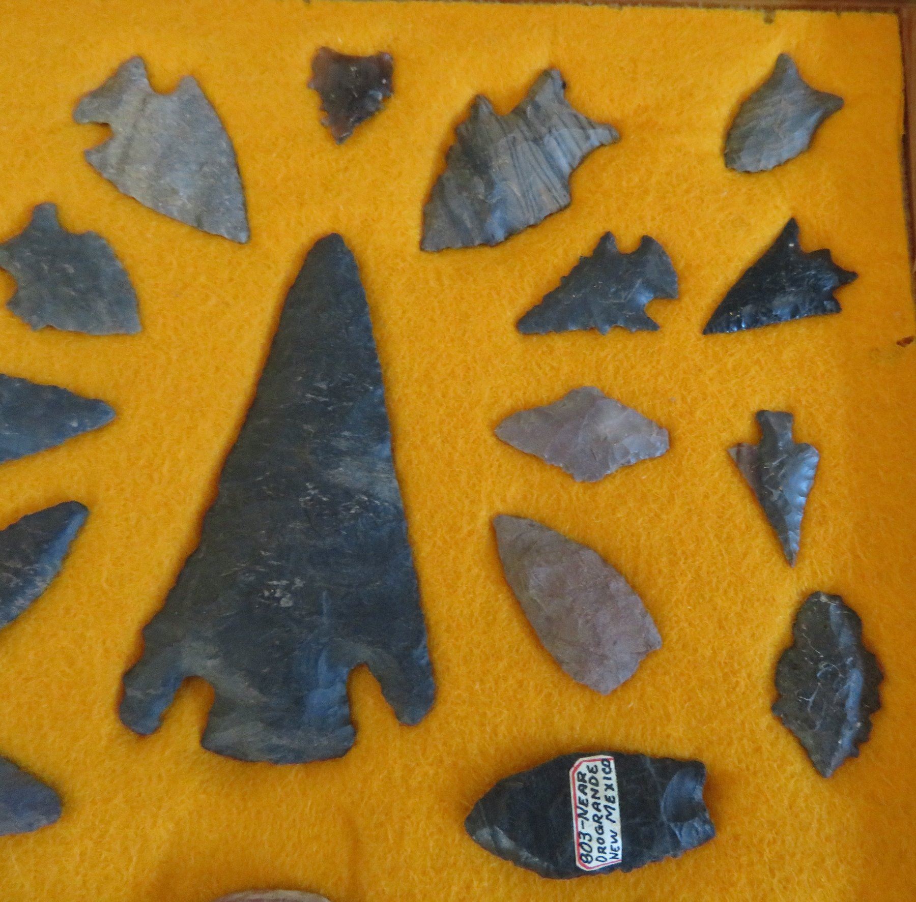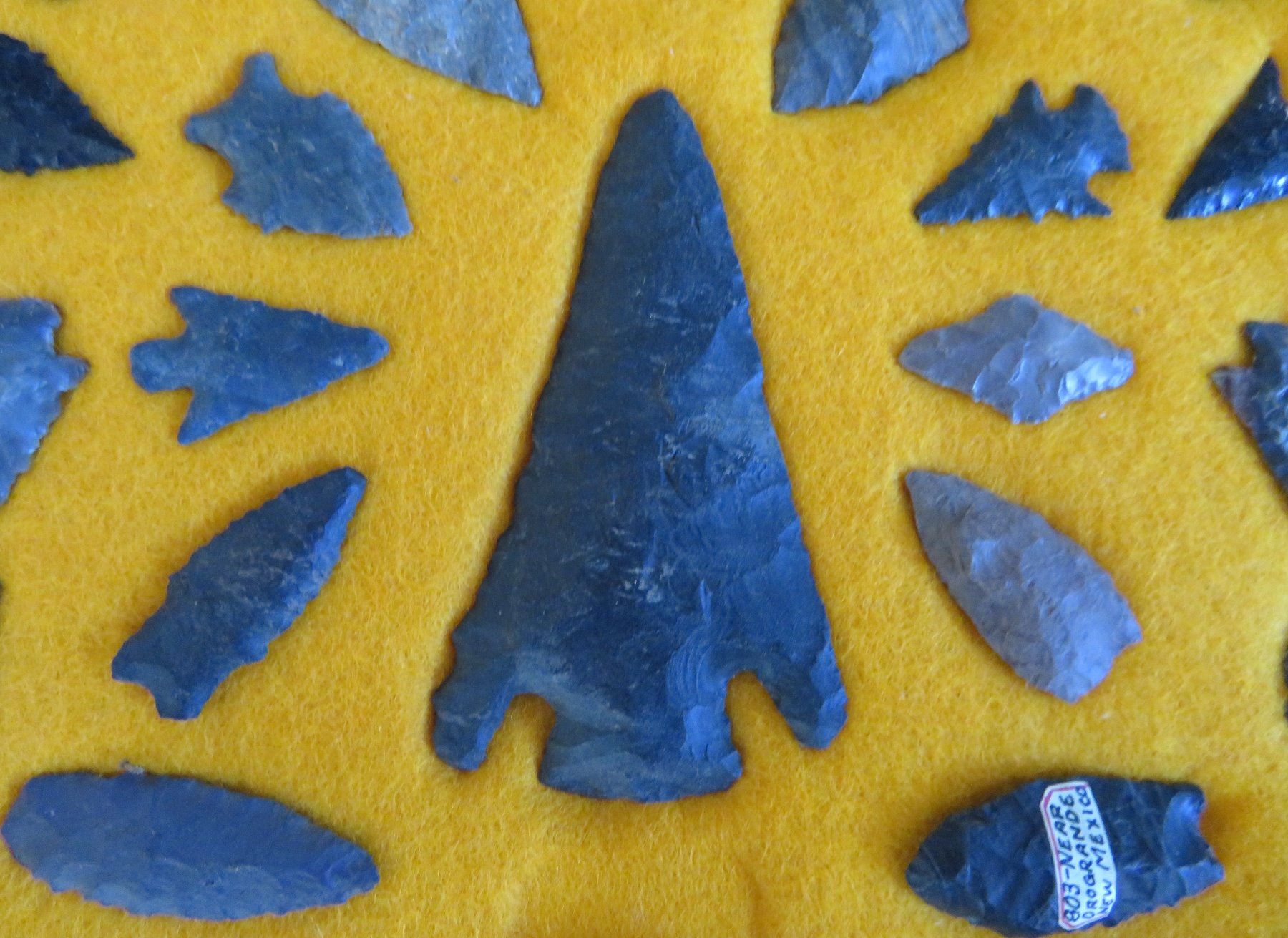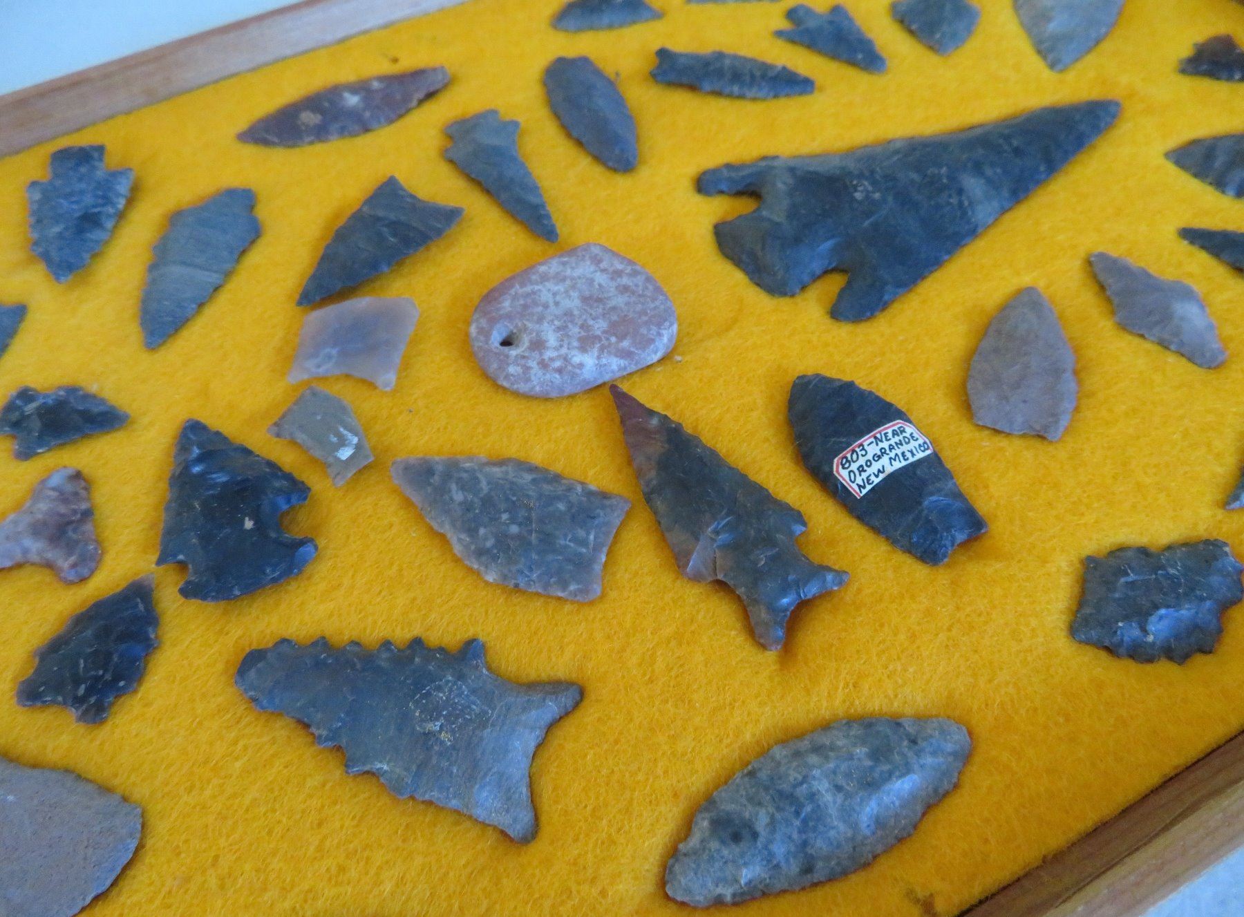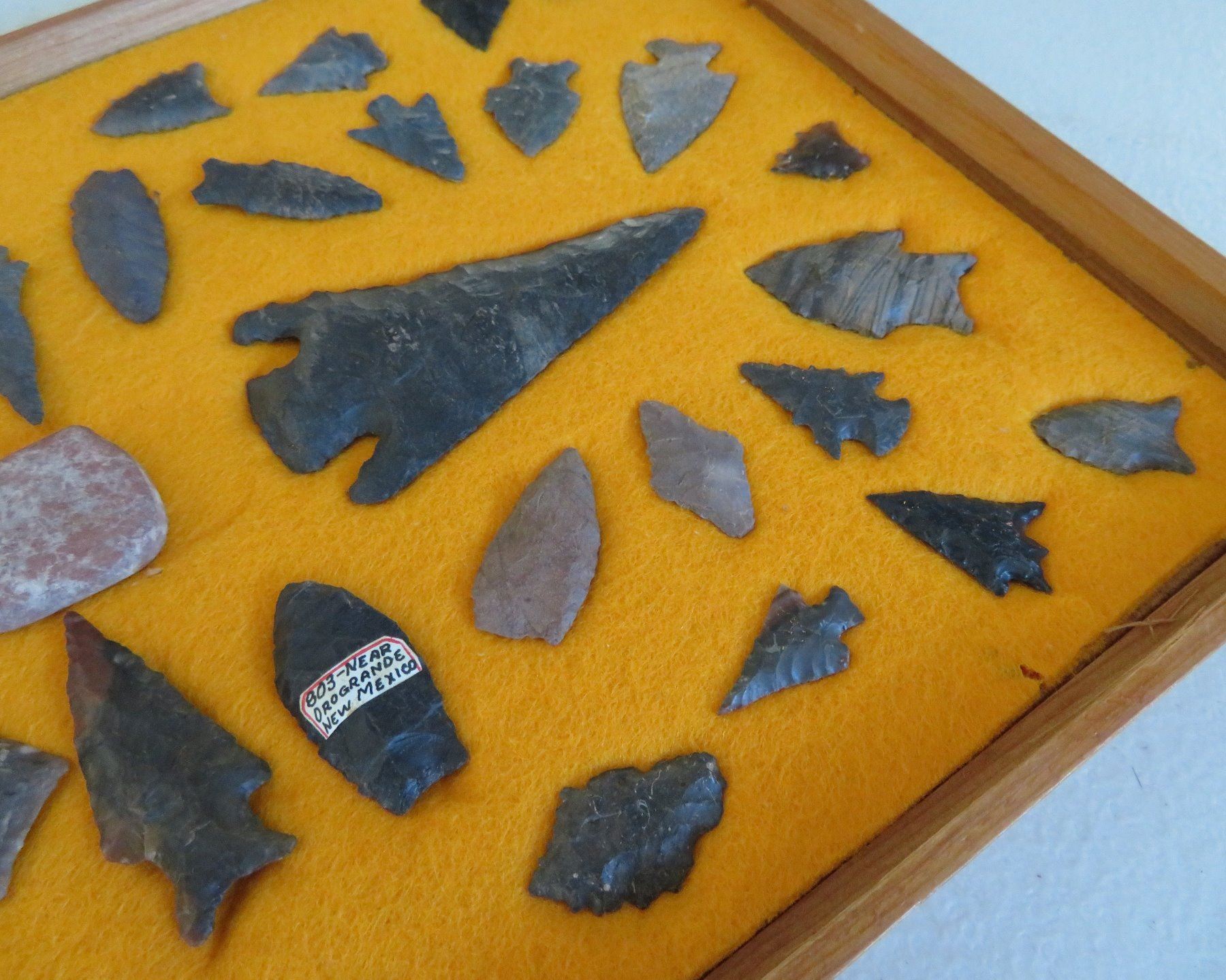 New Mexico Flint Collection, paleo to archaic periods. Made of flint, chert and petrified wood, the largest item measures 3 1/4". Orogrande, New Mexico. Note the 2 Folsom bases in center of frame, frame not included. Condition: As found, see images. Shipping: $30.00 w/insurance and signature, due to value.