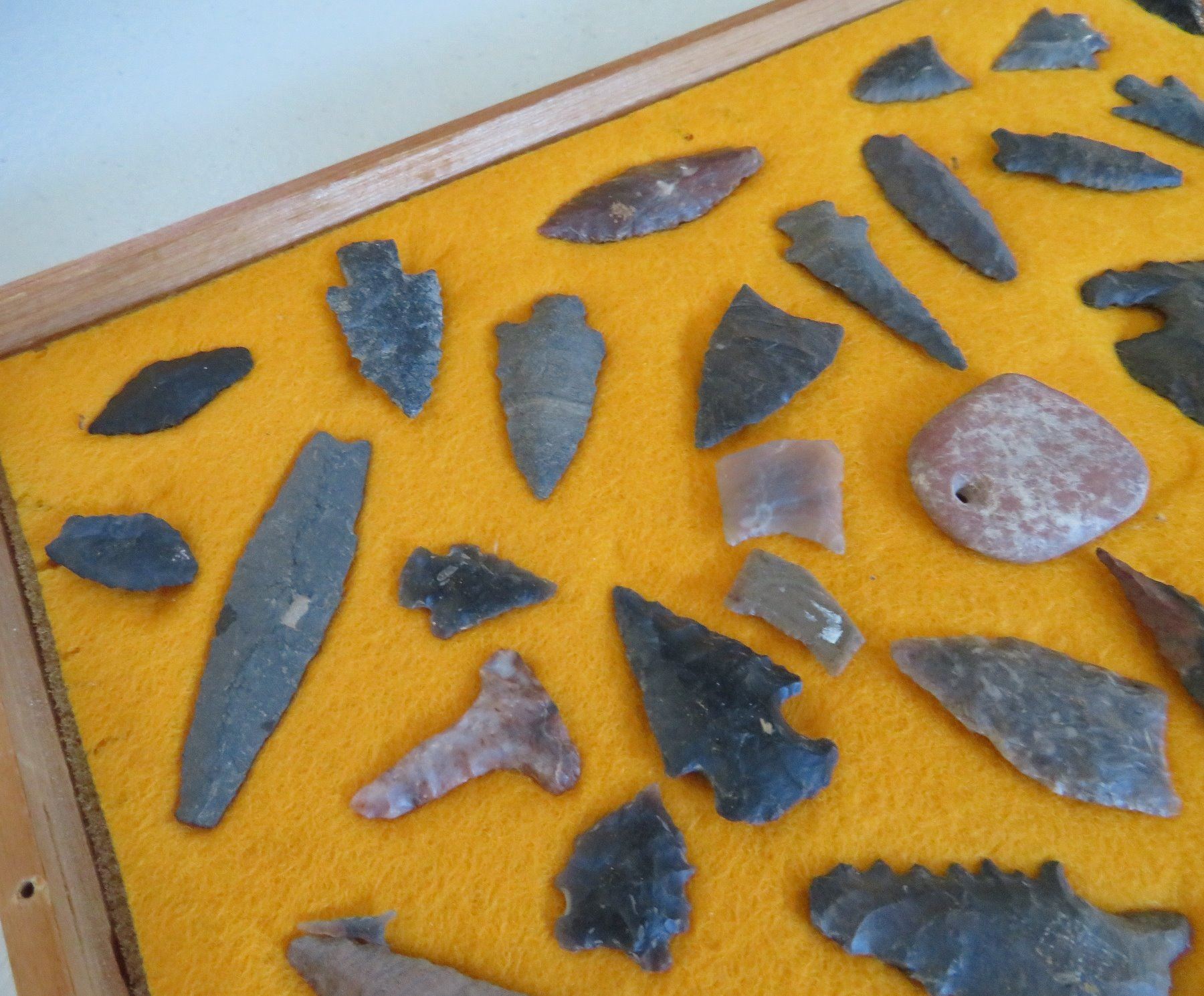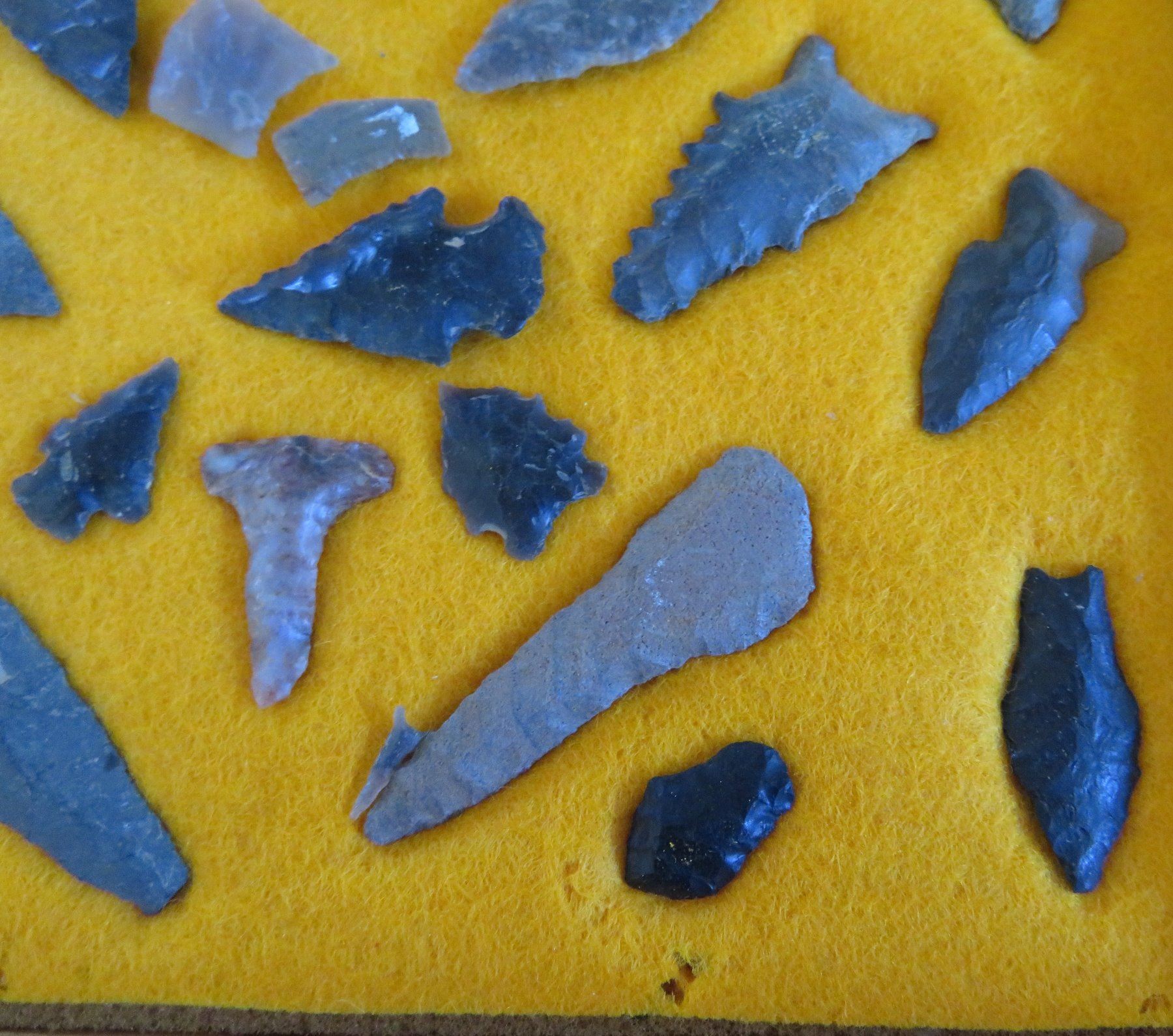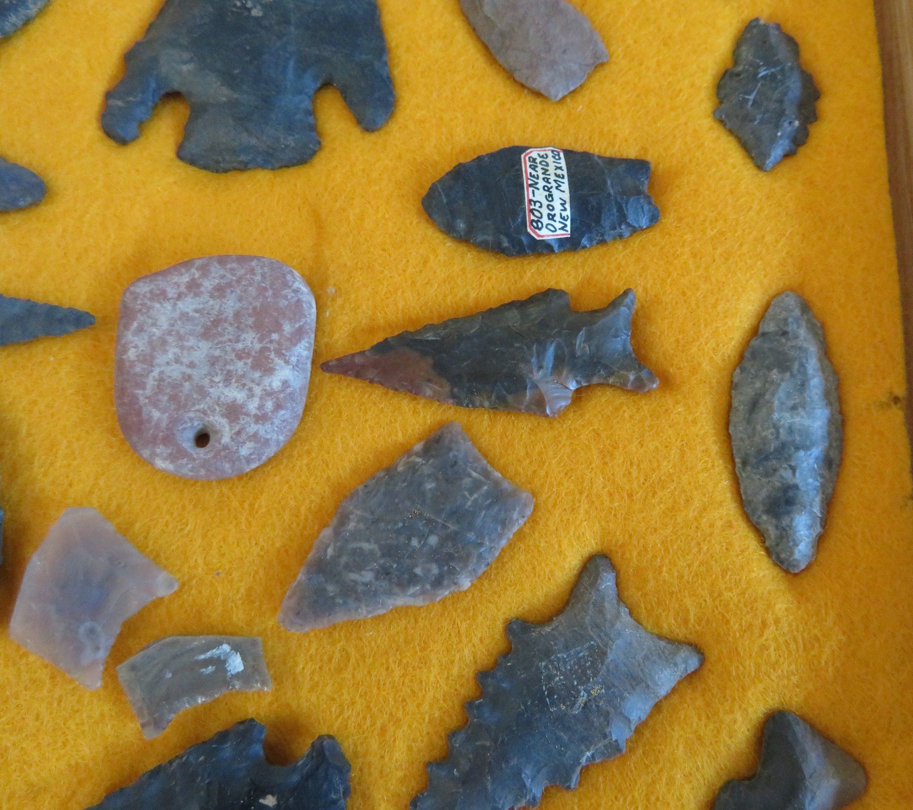 New Mexico Flint Collection, paleo to archaic periods. Made of flint, chert and petrified wood, the largest item measures 3 1/4". Orogrande, New Mexico. Note the 2 Folsom bases in center of frame, frame not included. Condition: As found, see images. Shipping: $30.00 w/insurance and signature, due to value.