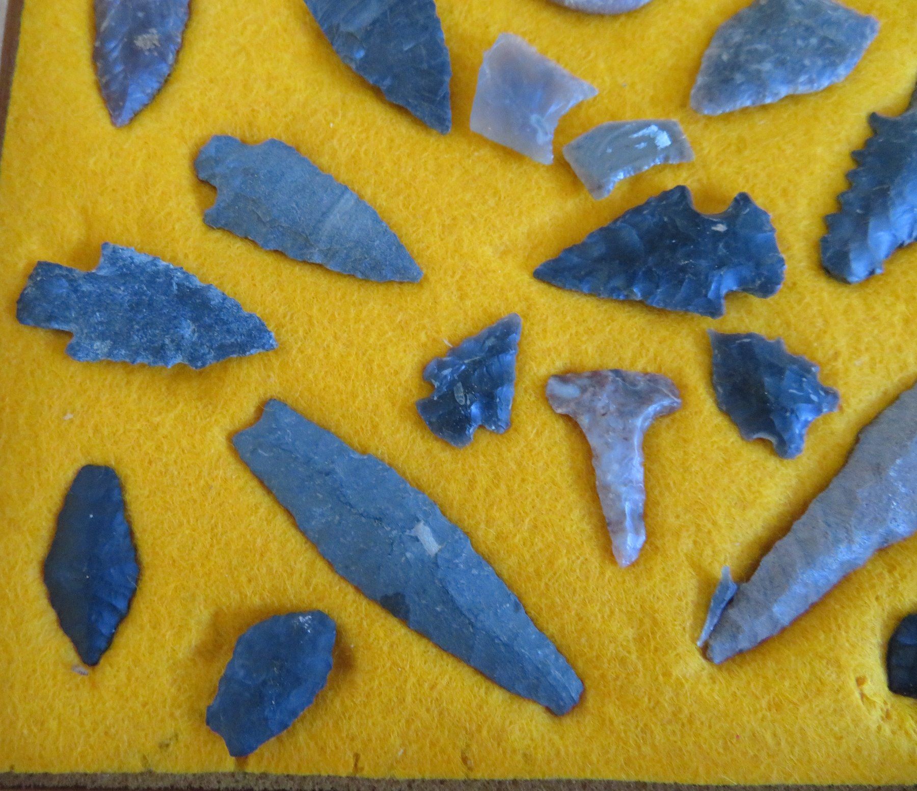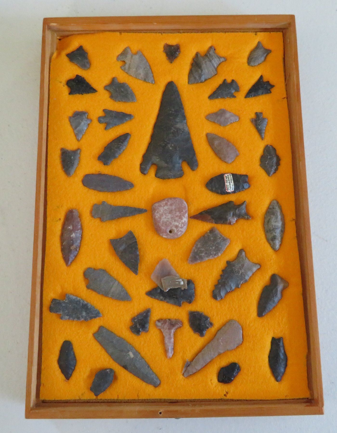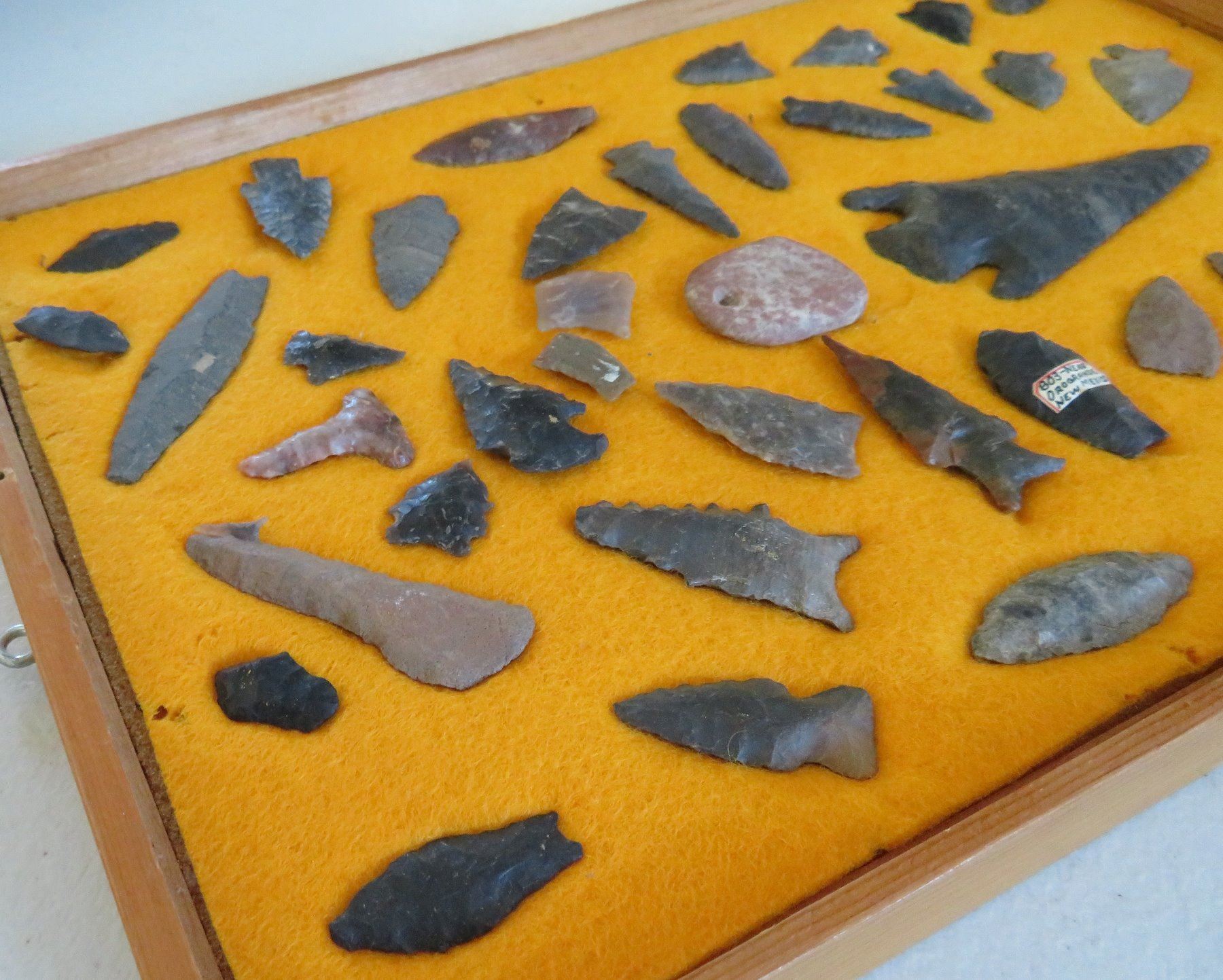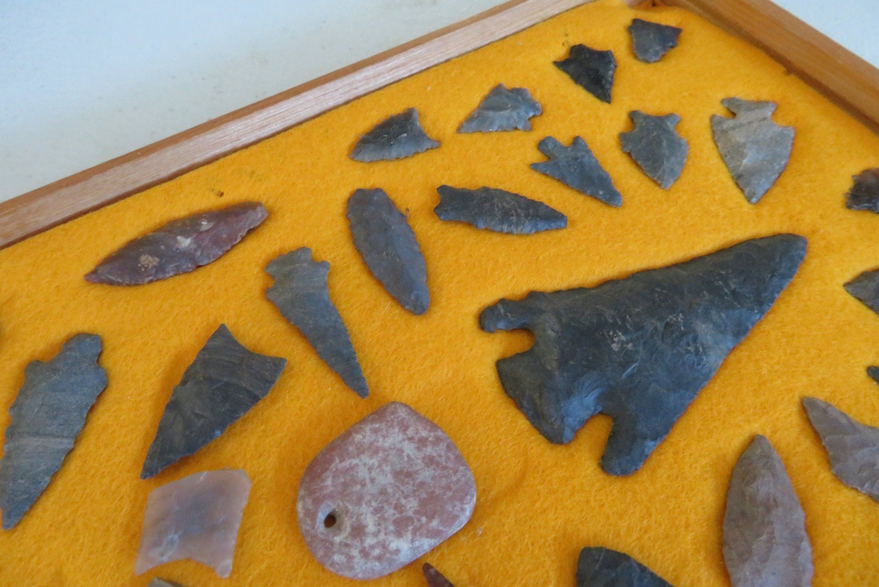 New Mexico Flint Collection, paleo to archaic periods. Made of flint, chert and petrified wood, the largest item measures 3 1/4". Orogrande, New Mexico. Note the 2 Folsom bases in center of frame, frame not included. Condition: As found, see images. Shipping: $30.00 w/insurance and signature, due to value.