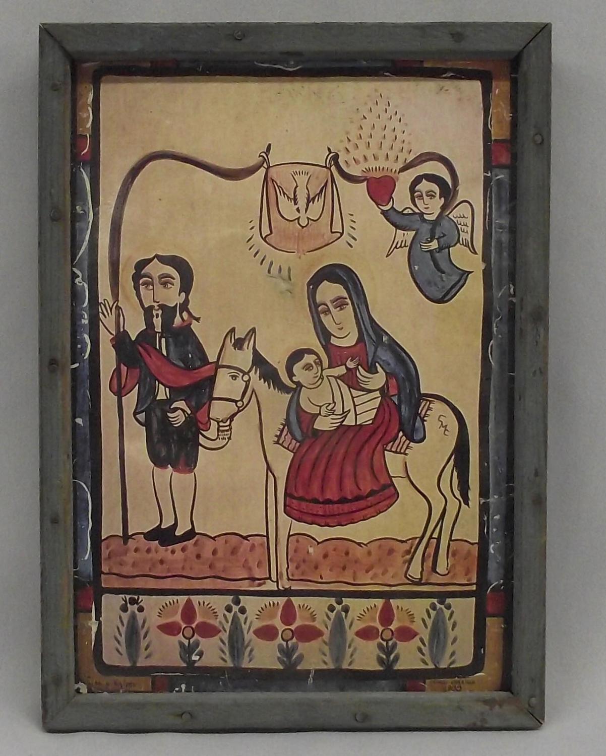 New Mexico Framed Retablo. Picture is a paper print pasted to wood board and measures 5.5''x7.75''. Framed in wood frame. Signature on bottom right corner, ''Charles Carrillo 1988.'' Buyers Pay Actual Shipping and Handling Charges(see terms and conditions for more information).
