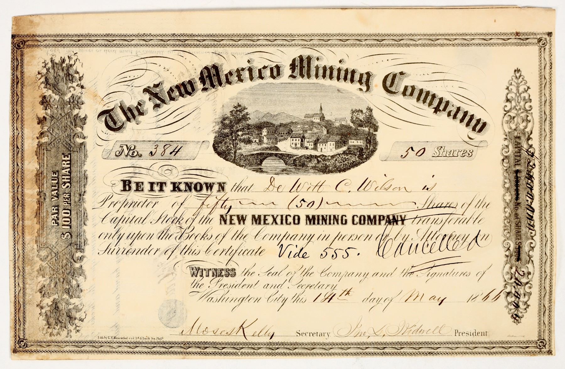 A stock certificate for 50 shares in The New Mexico Mining Company, dated May 14th, 1866. No. 384 issued, made out to DeWitt C. Wilson. Signed by secretary Moses Kelly and president Kidwell(?) with an embossed company seal at bottom left. Nice vignette of a small town. Lithography by L.N. Rosenthal. Significant staining/foxing along left edge, general toning across whole piece; see photos. 10"x6.25".
