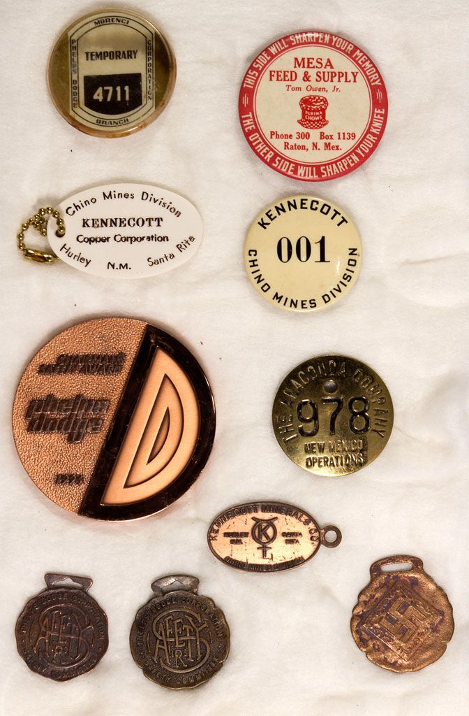 c1930, 1994 - Lot of 10 including 1) Medal: Chairman’s Safety award Phelps Dodge 1994. 2) Keychain: Chino Mines Division Kennecott Copper Corporation Hurley N.M. Santa Rita. 3)Pin: Phelps Dodge Corporation, Morenci Branch 4711. 4) Knife and scissors sharpener: Mesa Feed & Supply. 5) Pin: Kennecott Chino Mines Division 001. 6) The Anaconda Co. 978. New Mexico Operations. 7) Medal: Kennecott Minerals Co. Chino Mines Division. 8) & 9) Medals: Phelps Dodge Corporation Safety Committee. 10) Medal: Swastika Coal Co. Little wear. -61207