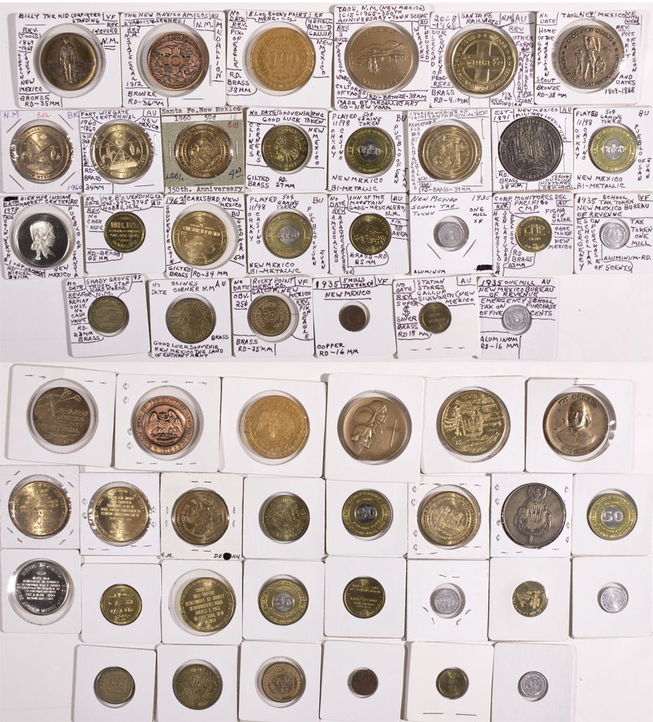 Lot of 28 tokens, coins, and medals including Billy the Kid centennial medals, Taos Anniversary tokens, So-Called Dollars, and a variety of other trade and Good For tokens. Start your collection today! -61003