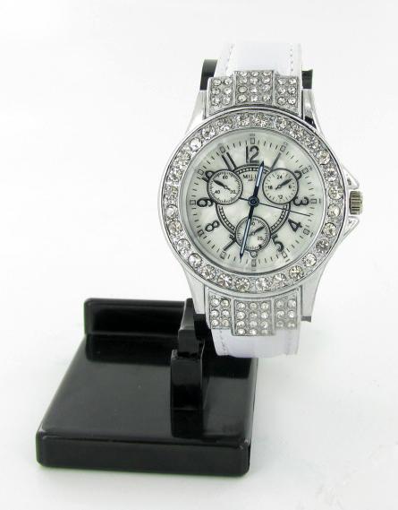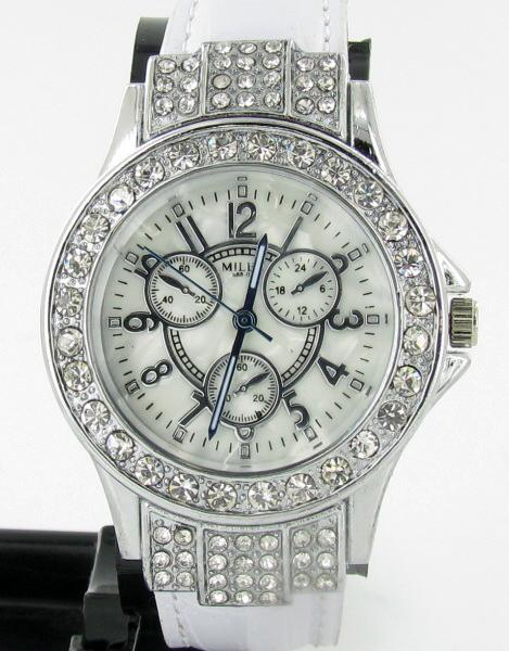 Brand New Miler ladies's stylish sport CHRONOGRAPH MOP face style watch in excellent new condition with 24-hour and dual tachy dials; stainless case and pink leather band; box; retail $1295