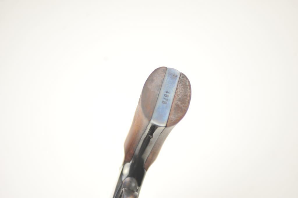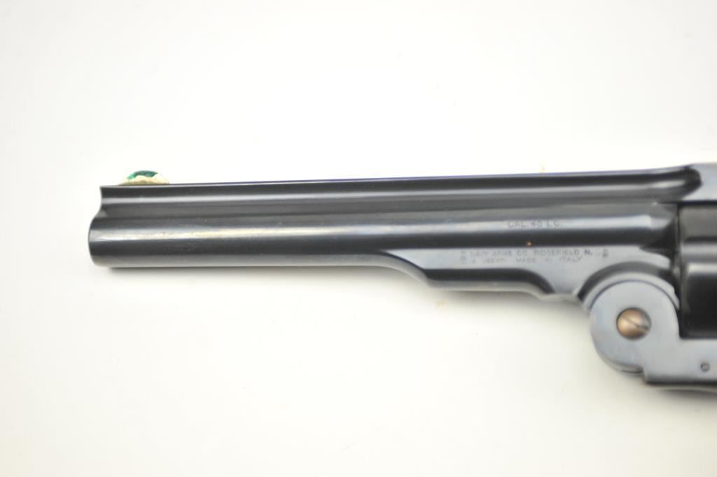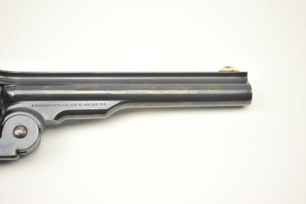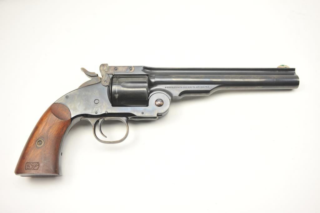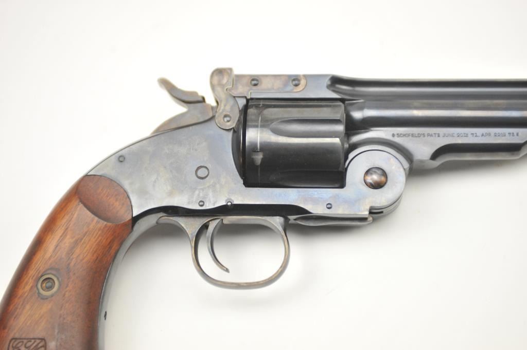 New Model Schofield 1875 Revolver by Navy Arms Co in .45 L.C. in excellent condition in box with western style double loop holster, S/N 4870. Shows simulated inspectors marks on wood grips and close respect to detail onoriginal. 98% with minor index line and showing a little firing and use. Est.: $400-$800