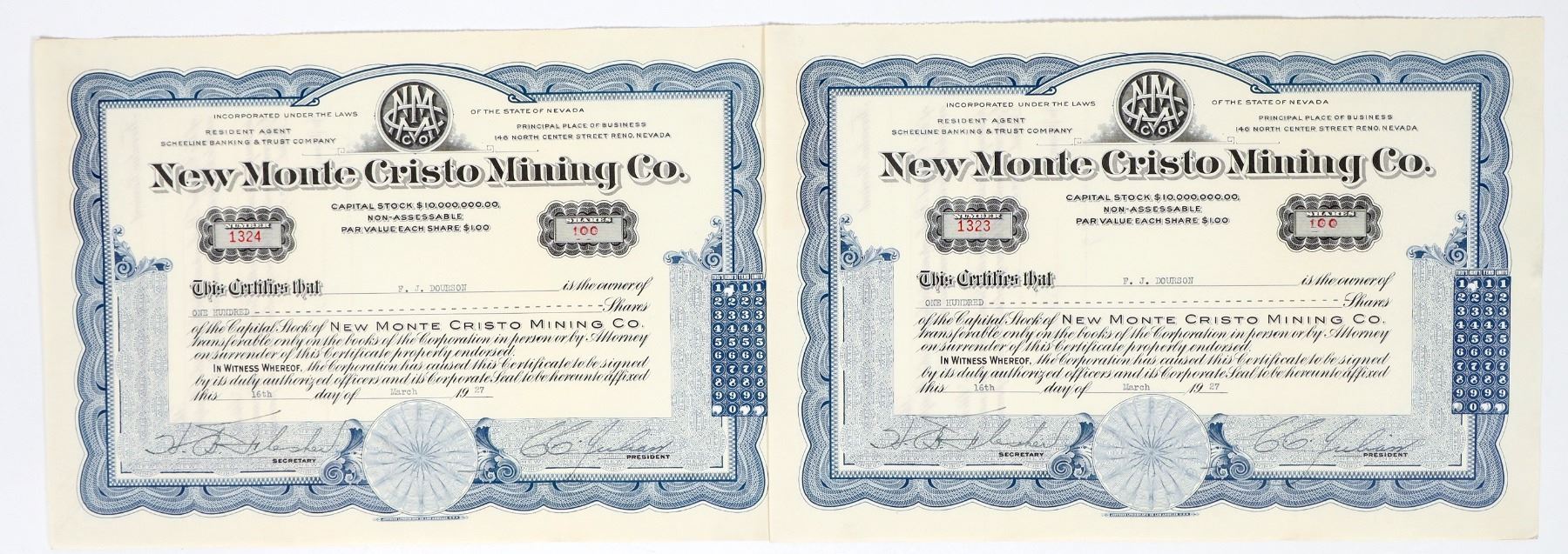 Inc. in Nevada. Two stocks issued in 1927 and signed by president C.C. Julian, the notorious stock swindler. The New Monte Cristo Mining Company's principal place of business was 146 North Center Street, Reno, Nevada. The Los Angeles Julian Petroleum Company sold hundreds of millions of dollars of fraudulent stock to naive investors. Julian sold the company in 1924 to Sheridan C. Lewis and moved to Nevada. Julian had three consecutive firms (Western Lead, Julian Merger Mines and New Monte Cristo Mining) that tried and failed to duplicate the success, short-lived and unsustainable as it was, he'd scored with "Julian Pete." One news article, titled "Julian Back, Vociferating," published in the Los Angeles Times on 27 May 1927, described how the colorful promoter returned and declared his intention to "put the crooks in jail." While he claimed to be protecting the stockholders, the paper pointed out that Julian had a half-dozen schemes that were undertaken with "a consistent and persistent effort to evade the laws provided for the safeguarding of investors." After jumping $25,000 bail, he committed suicide in March of 1934 in Shanghai.