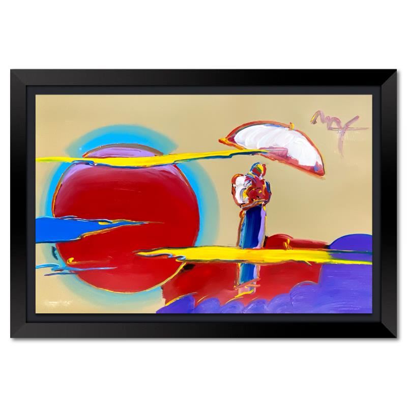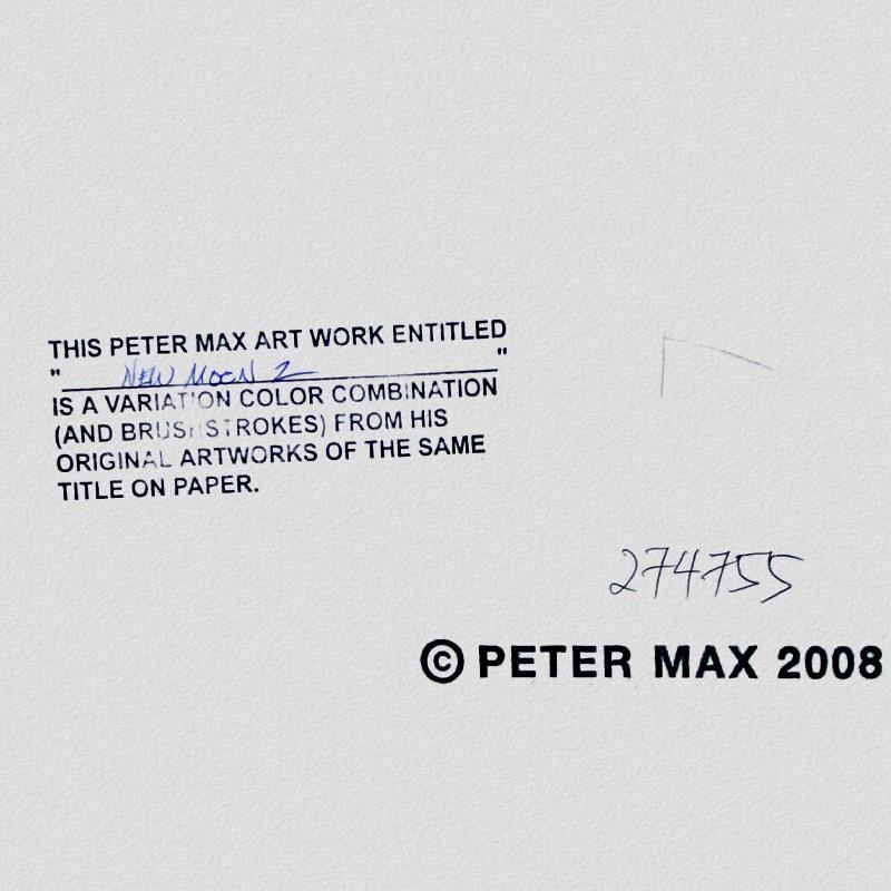 "New Moon 2" is a one-of-a-kind mixed media on paper, hand signed by Peter Max. The piece comes custom framed with a backside cutout to display Peter Max Studio registration number 274755 certifying authenticity. Measures approximately 30" x 42" (frame), 24" x 36" (image).
