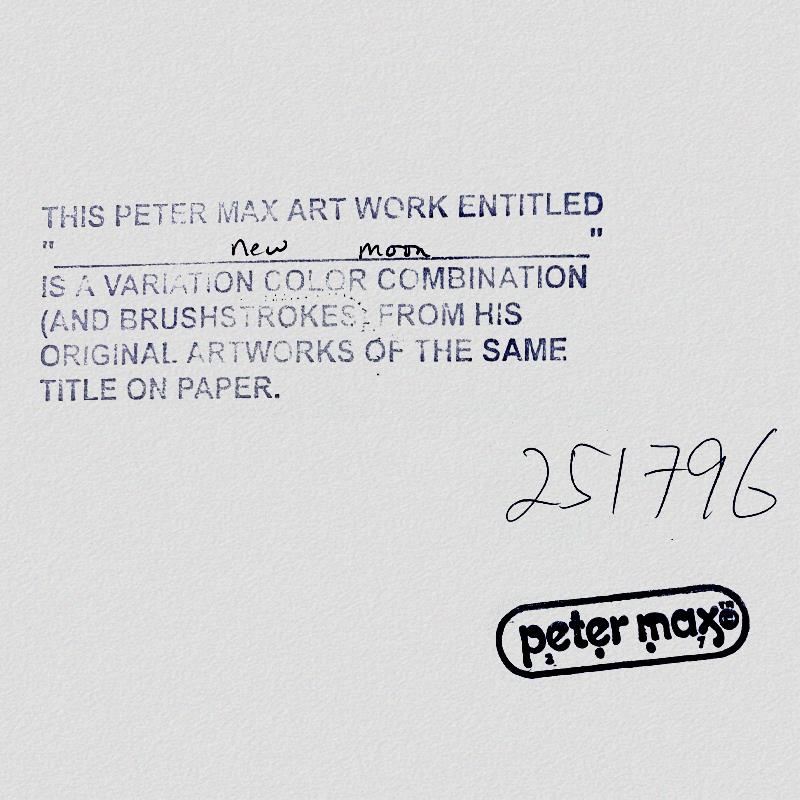 "New Moon 2" is a one-of-a-kind mixed media on paper, hand signed by Peter Max. The piece comes custom framed with a backside cutout to display Peter Max Studio registration number 251796 certifying authenticity. Measures approximately 36" x 48" (frame), 24" x 36" (image). This item requires special handling and may have a longer than usual turnaround.