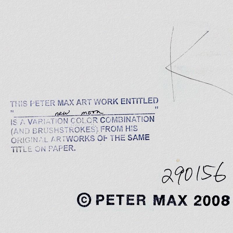 "New Moon 2" is a one-of-a-kind mixed media on paper, hand signed by Peter Max. The piece comes custom framed with a backside cutout to display Peter Max Studio registration number 290156 certifying authenticity. Measures approximately 48" x 36" (frame), 24" x 36" (image). This item requires special handling and may have a longer than usual turnaround.