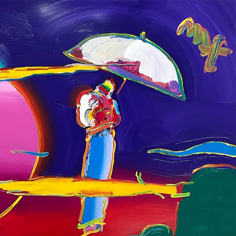 "New Moon" is a one-of-a-kind acrylic mixed media on paper, hand signed by Peter Max. The piece comes custom framed with a backside cutout to display Peter Max Studio registration number 253161 certifying authenticity. Measures approx. 36.5" x 48.5" (frame), 24" x 36" (image).