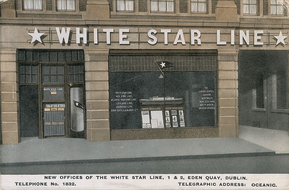 Unused color postcard featuring an illustrated likeness of the White Star Line offices, captioned at the bottom: "”New offices of the White Star Line, 1 & 2, Eden Quay, Dublin. Telephone No. 1832, Telegraphic Address: Oceanic.” In fine condition, with trivial corner tip dings.