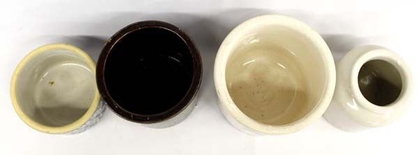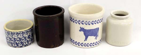 New & Old Crocks, includes 1. Brown Redwing Crock that is marked on the bottom and does have a couple of chips, 2. Clay City Pottery Crock 3. French LAB-Lagny mustard crock, 4. Large Folk Art Crock, unmarked, largest measures 5'' x 6''
