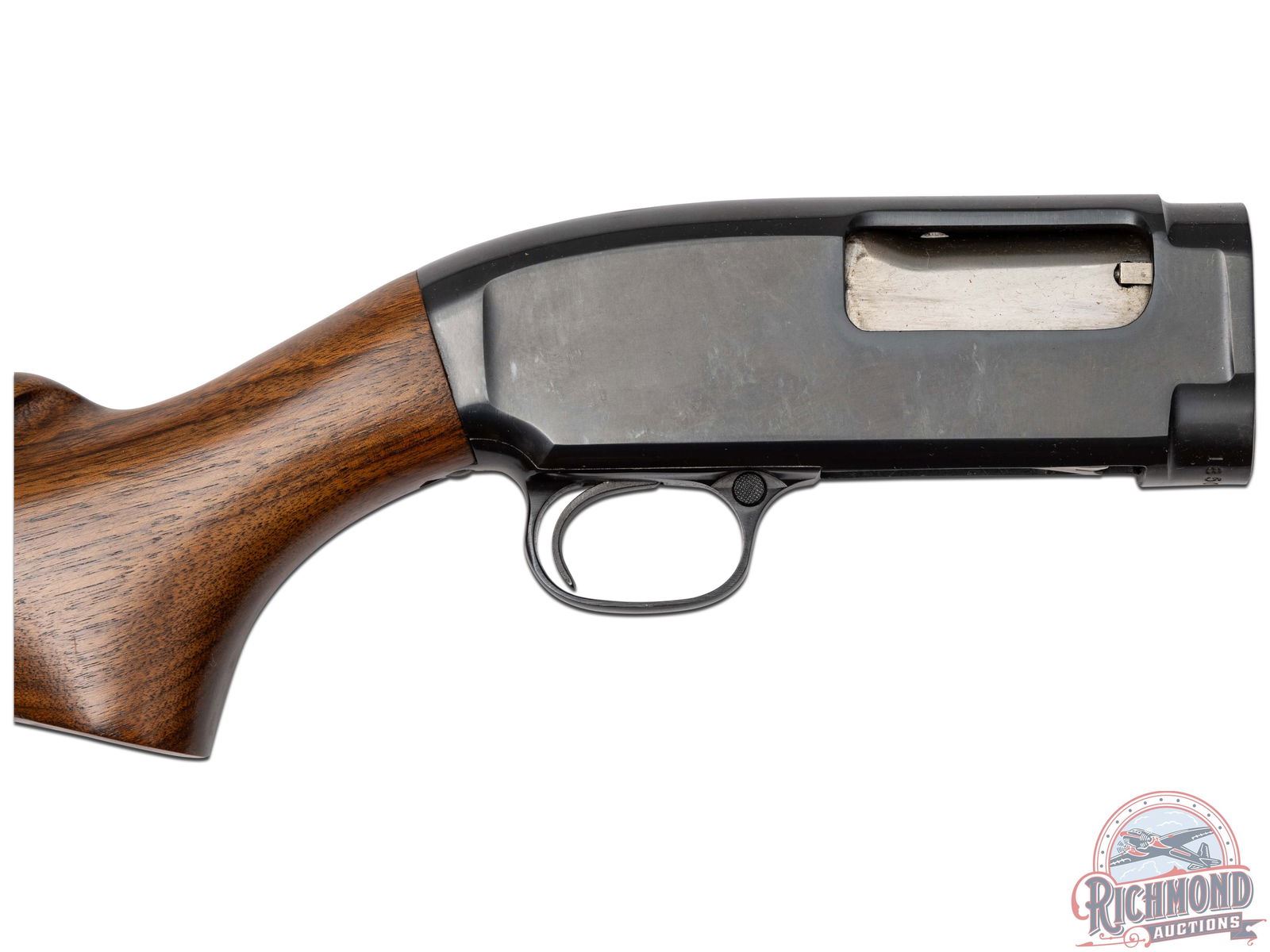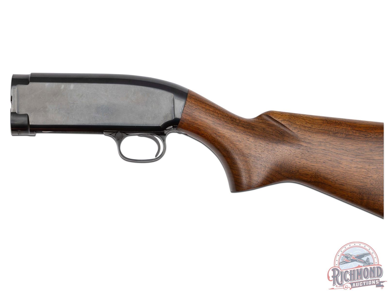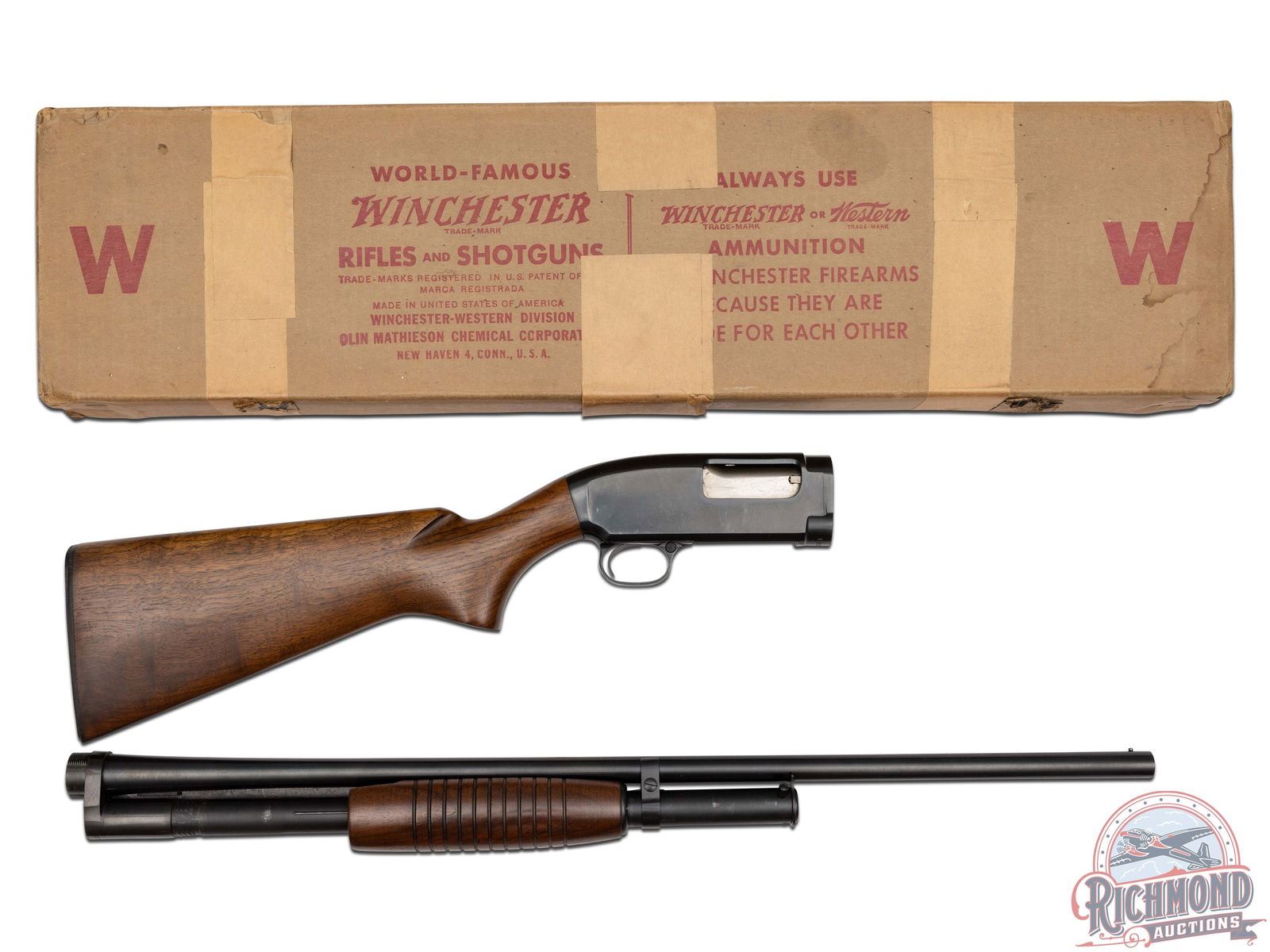 This perfect repeater shotgun was manufactured in 1959 and today is still in unfired, condition in the original box. Features a 28" blued barrel chambered for 2-3/4" shells with Modified choke. All standard Winchester stampings and proof marks. Nickel bead front sight and crossbolt safety. Straight grain walnut wood stock and ribbed forearm. Comes in the original factory box with hanging tag and factory instruction manual. LOP: 14". DAC: 1-3/4". DAH: 1-7/8". CALIBER: 20 GA. S/N: 1850759. FFL STATUS: Curio & Relic.