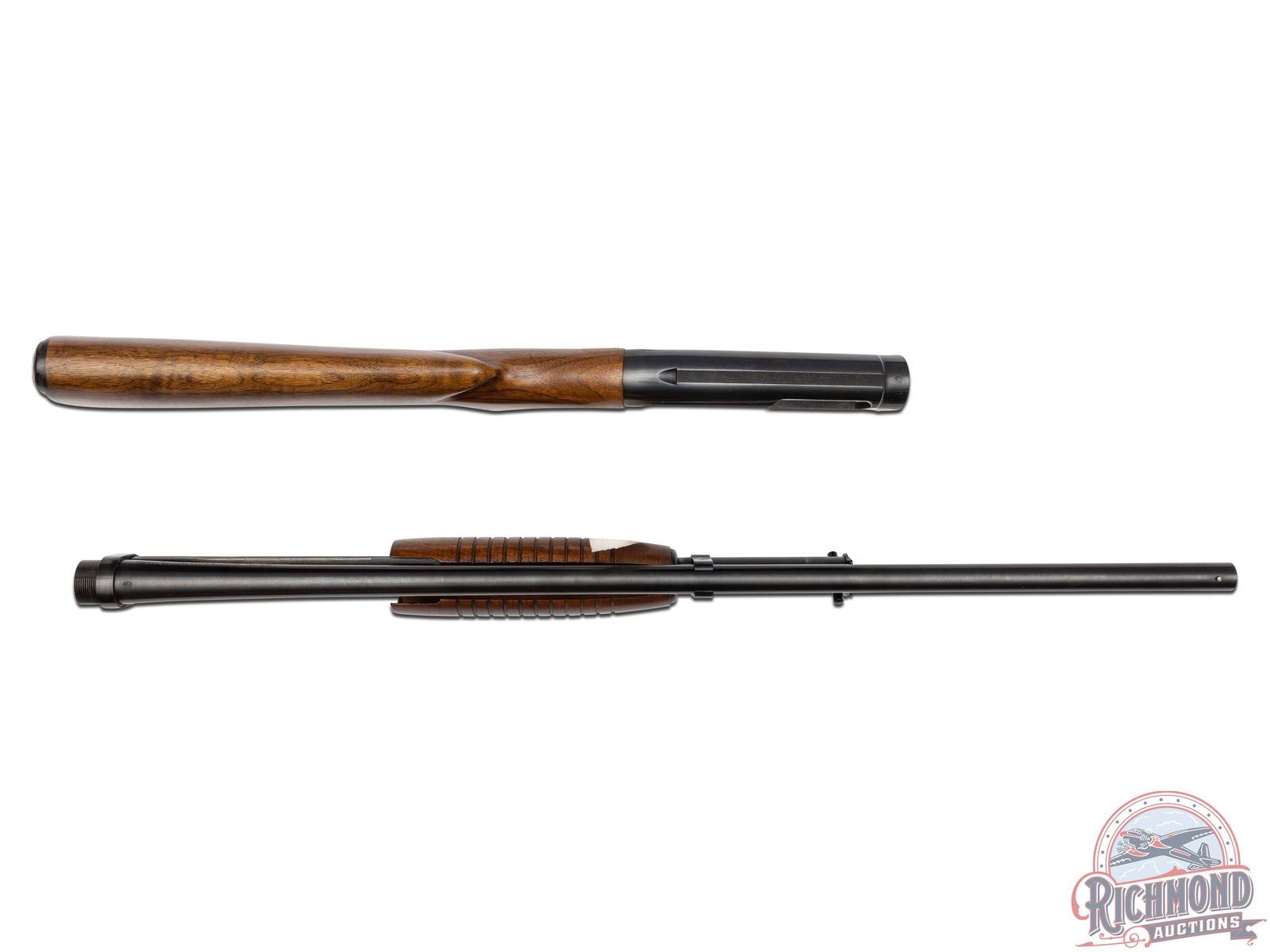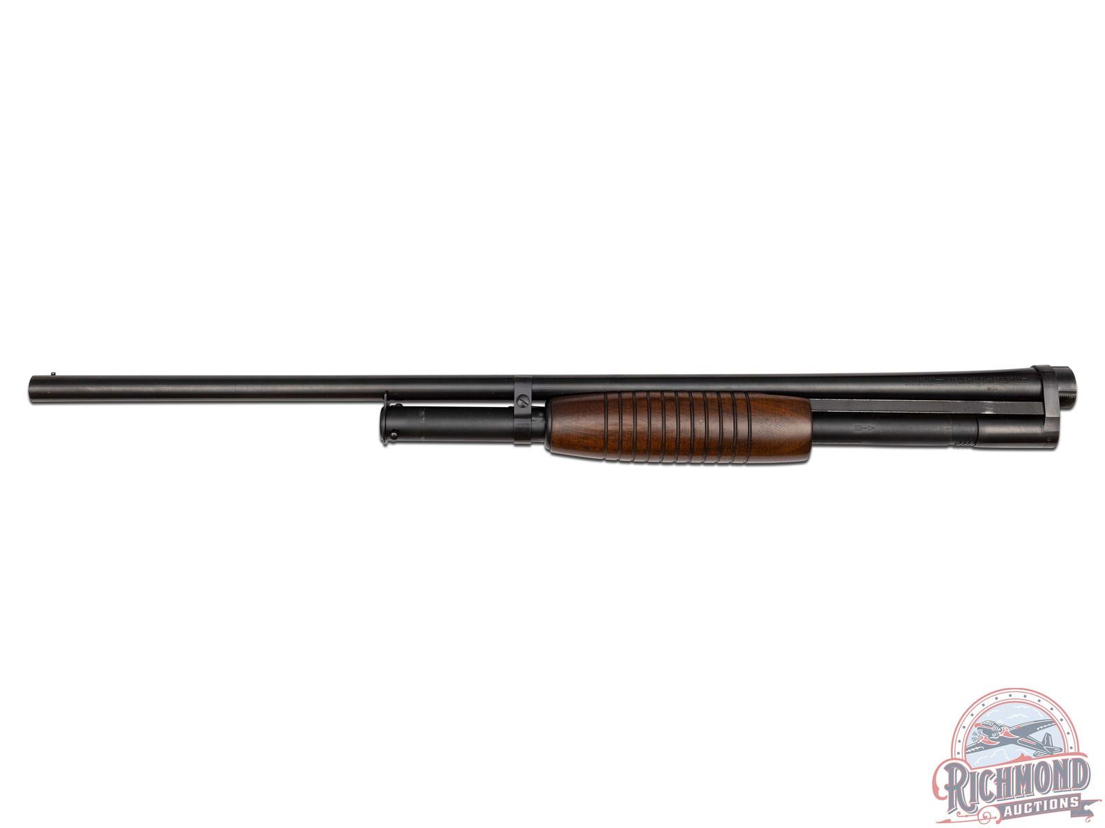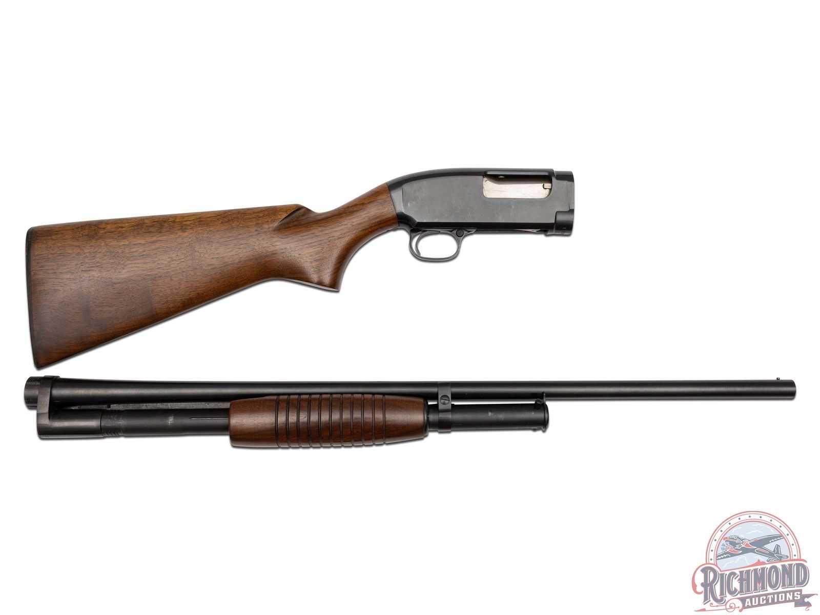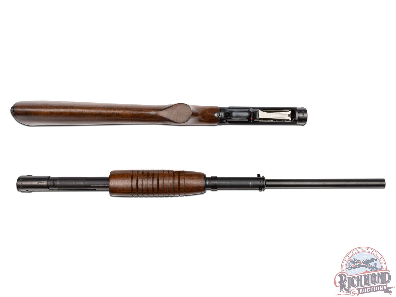 This perfect repeater shotgun was manufactured in 1959 and today is still in unfired, condition in the original box. Features a 28" blued barrel chambered for 2-3/4" shells with Modified choke. All standard Winchester stampings and proof marks. Nickel bead front sight and crossbolt safety. Straight grain walnut wood stock and ribbed forearm. Comes in the original factory box with hanging tag and factory instruction manual. LOP: 14". DAC: 1-3/4". DAH: 1-7/8". CALIBER: 20 GA. S/N: 1850759. FFL STATUS: Curio & Relic.
