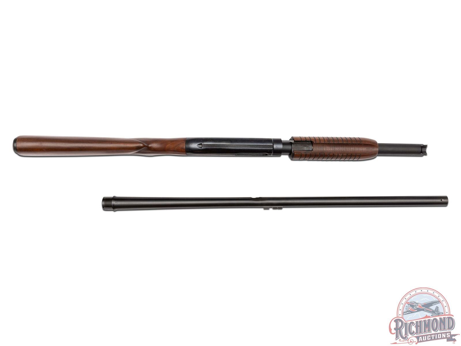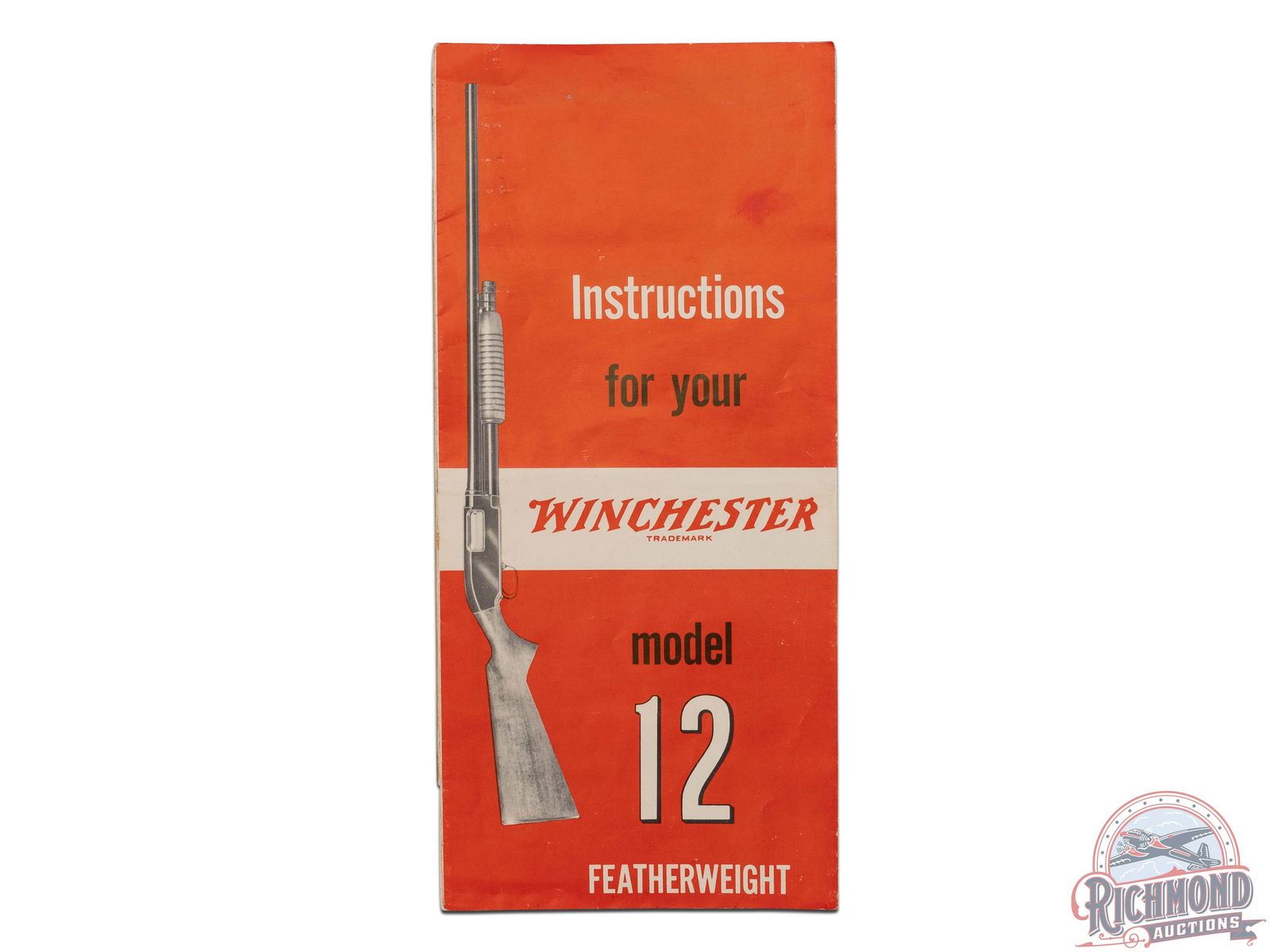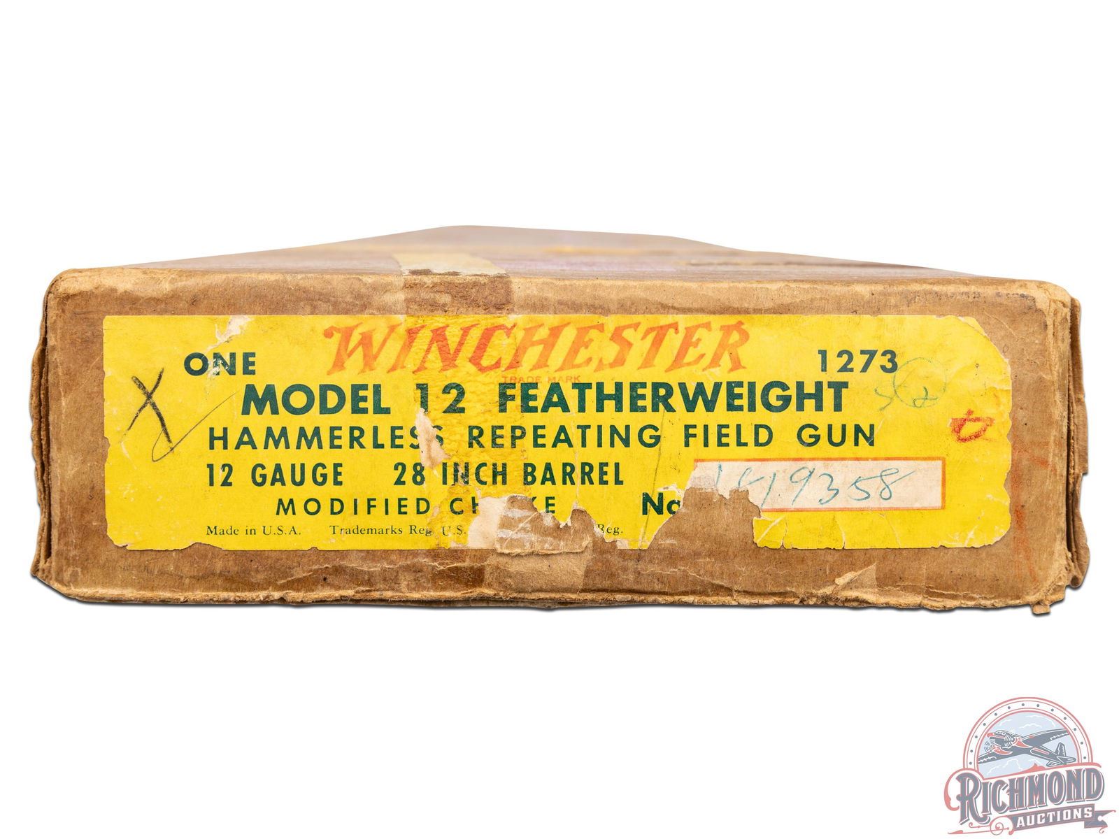 Manufactured in 1961. This Featherweight shotgun features a 28" round blued barrel chambered for 2-3/4" shells with modified choke and nickel bead front sight. Blued receiver, 5 round magazine tube and crossbolt safety. Smooth walnut stock with pistol grip and ribbed forearm. Comes in the original take-down factory cardboard box with factory manual and original hanging tag. LOP: 14". DAC: 1-1/2". DAH: 2-1/4". CALIBER: 12 GA. S/N: 1819358F. FFL STATUS: Curio & Relic.