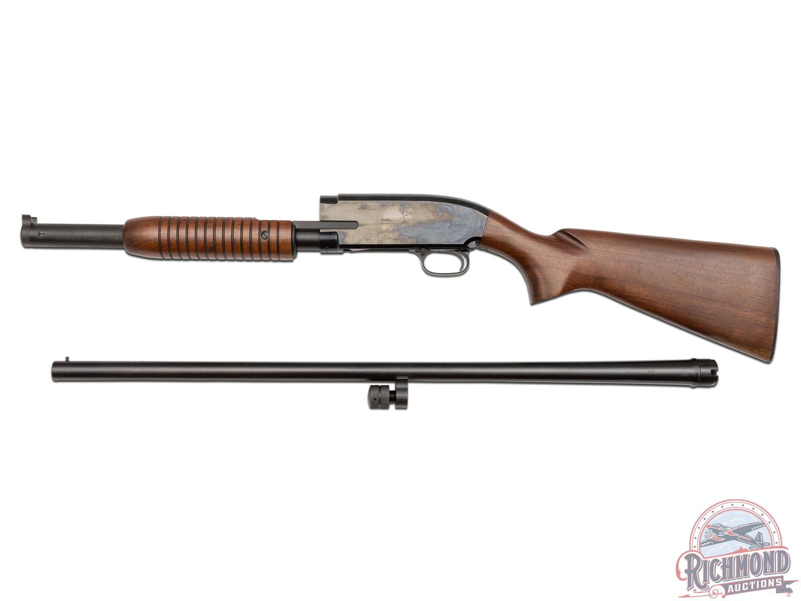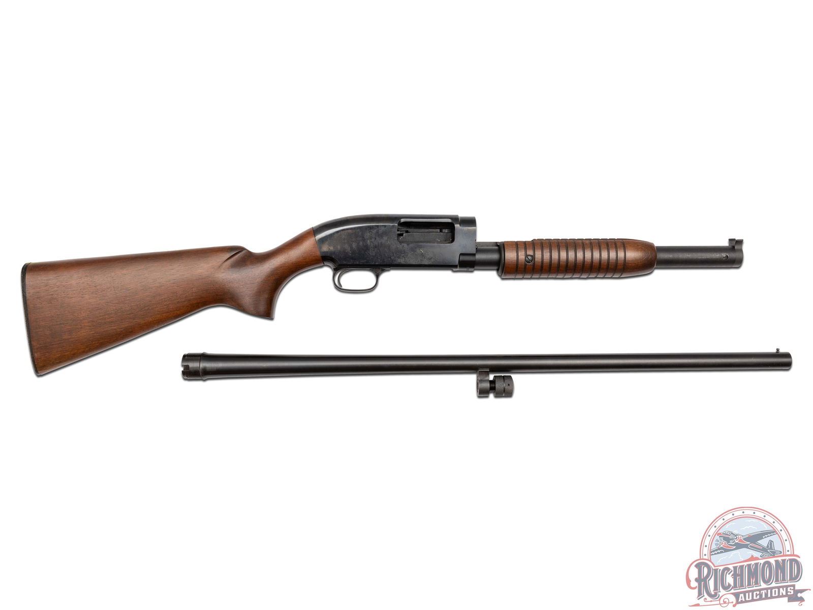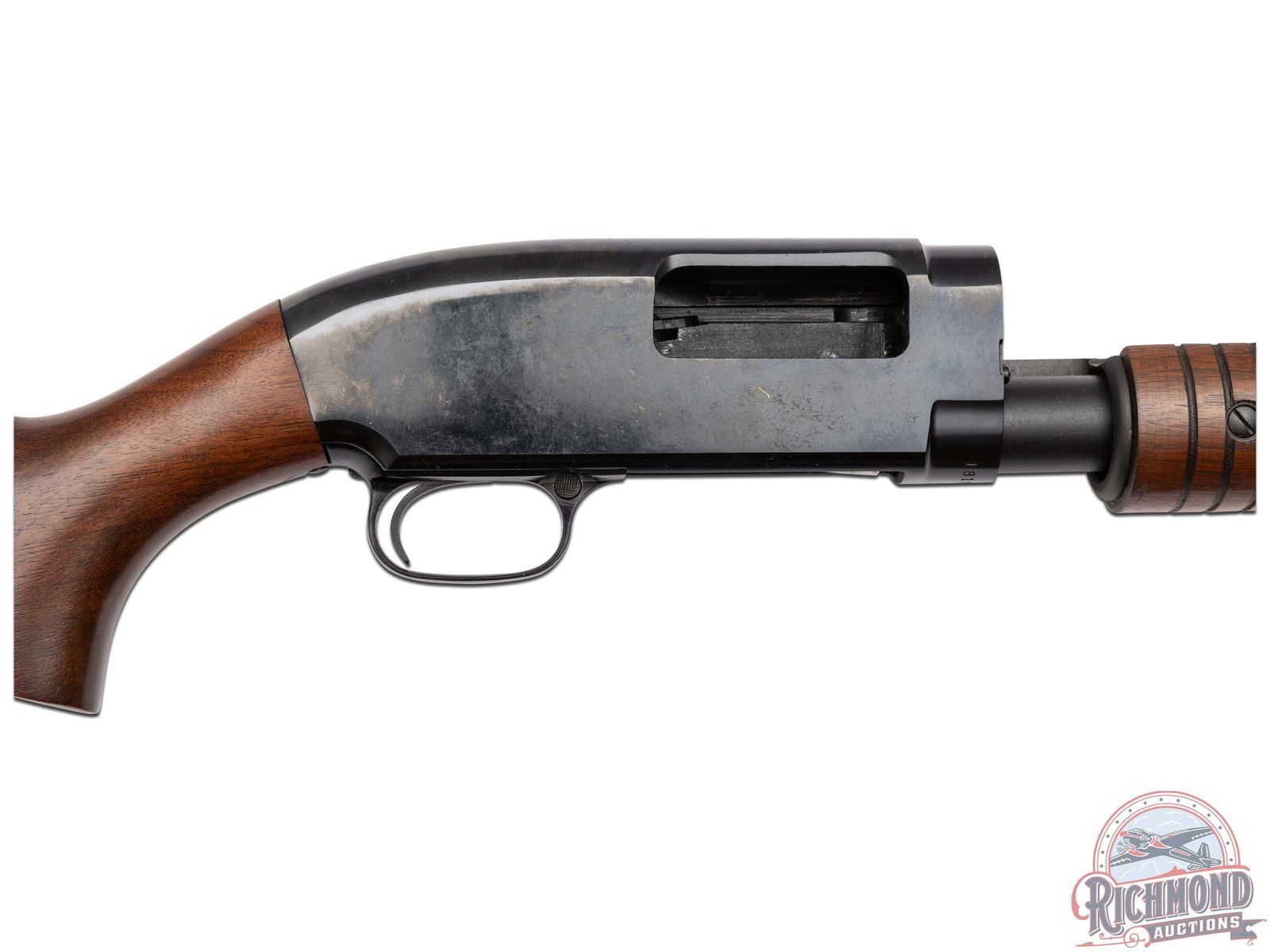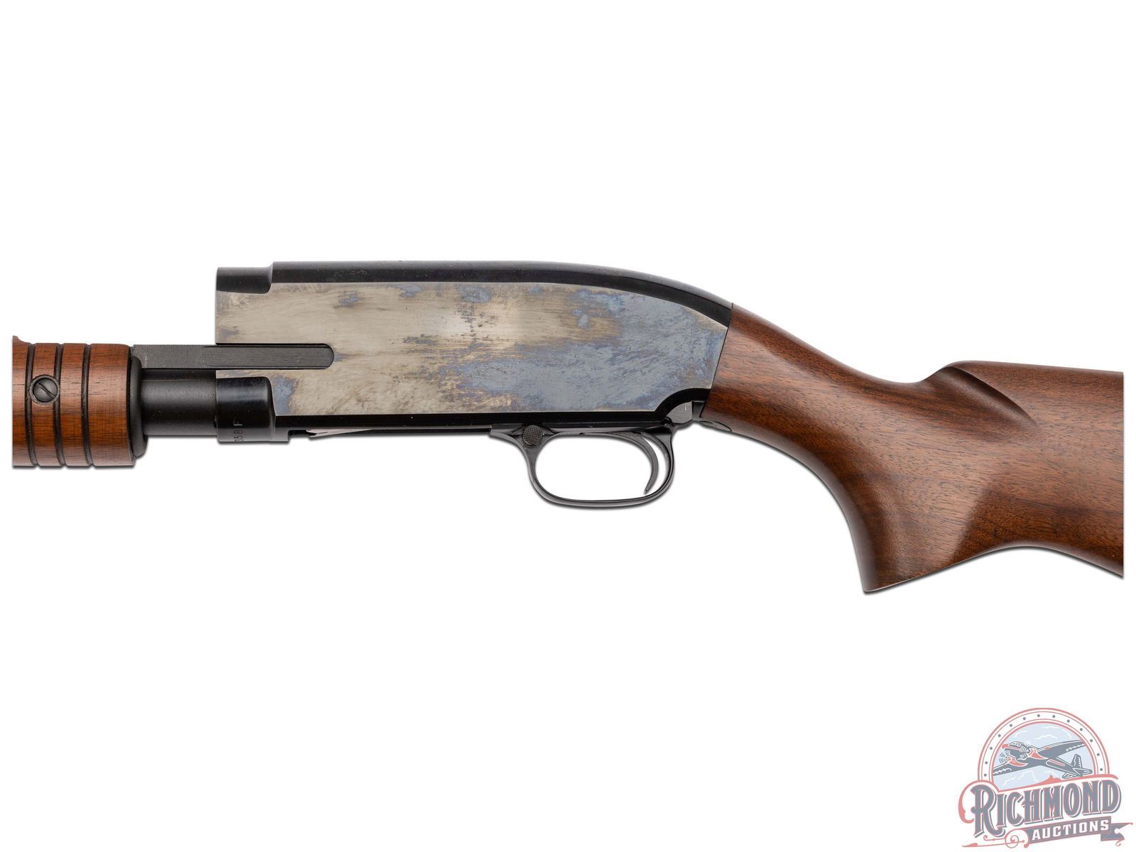 Manufactured in 1961. This Featherweight shotgun features a 28" round blued barrel chambered for 2-3/4" shells with modified choke and nickel bead front sight. Blued receiver, 5 round magazine tube and crossbolt safety. Smooth walnut stock with pistol grip and ribbed forearm. Comes in the original take-down factory cardboard box with factory manual and original hanging tag. LOP: 14". DAC: 1-1/2". DAH: 2-1/4". CALIBER: 12 GA. S/N: 1819358F. FFL STATUS: Curio & Relic.