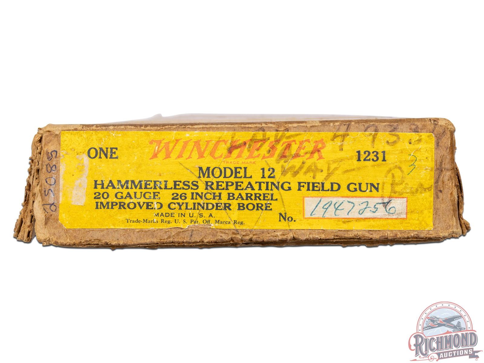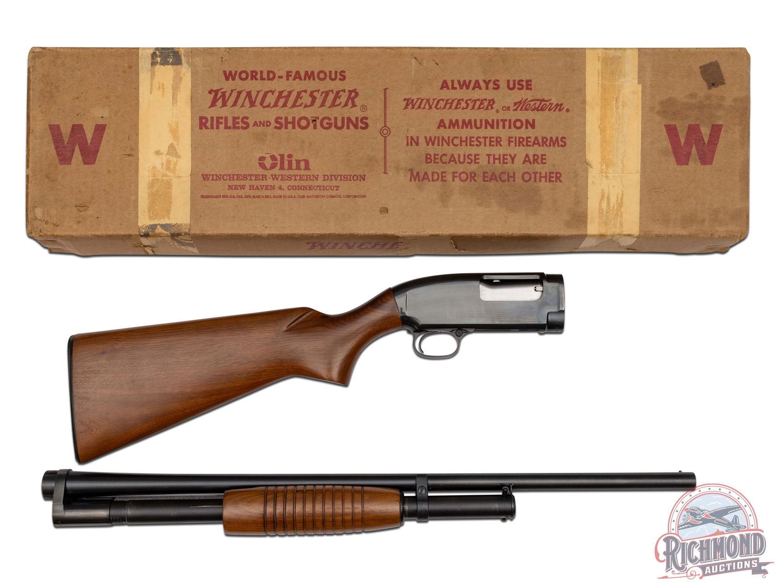 This perfect repeater shotgun was manufactured in 1963 and today is still in unfired, condition in the original box. Features a 28" blued barrel chambered for 2-3/4" shells with Modified Cylinder choke. All standard Winchester stampings and proof marks. Nickel bead front sight and crossbolt safety. Straight grain walnut wood stock and ribbed forearm. Comes in the original factory box with original factory instruction manual. LOP: 14". DAC: 1-3/4". DAH: 1-7/8". CALIBER: 20 GA. S/N: 1947256. FFL STATUS: Curio & Relic.