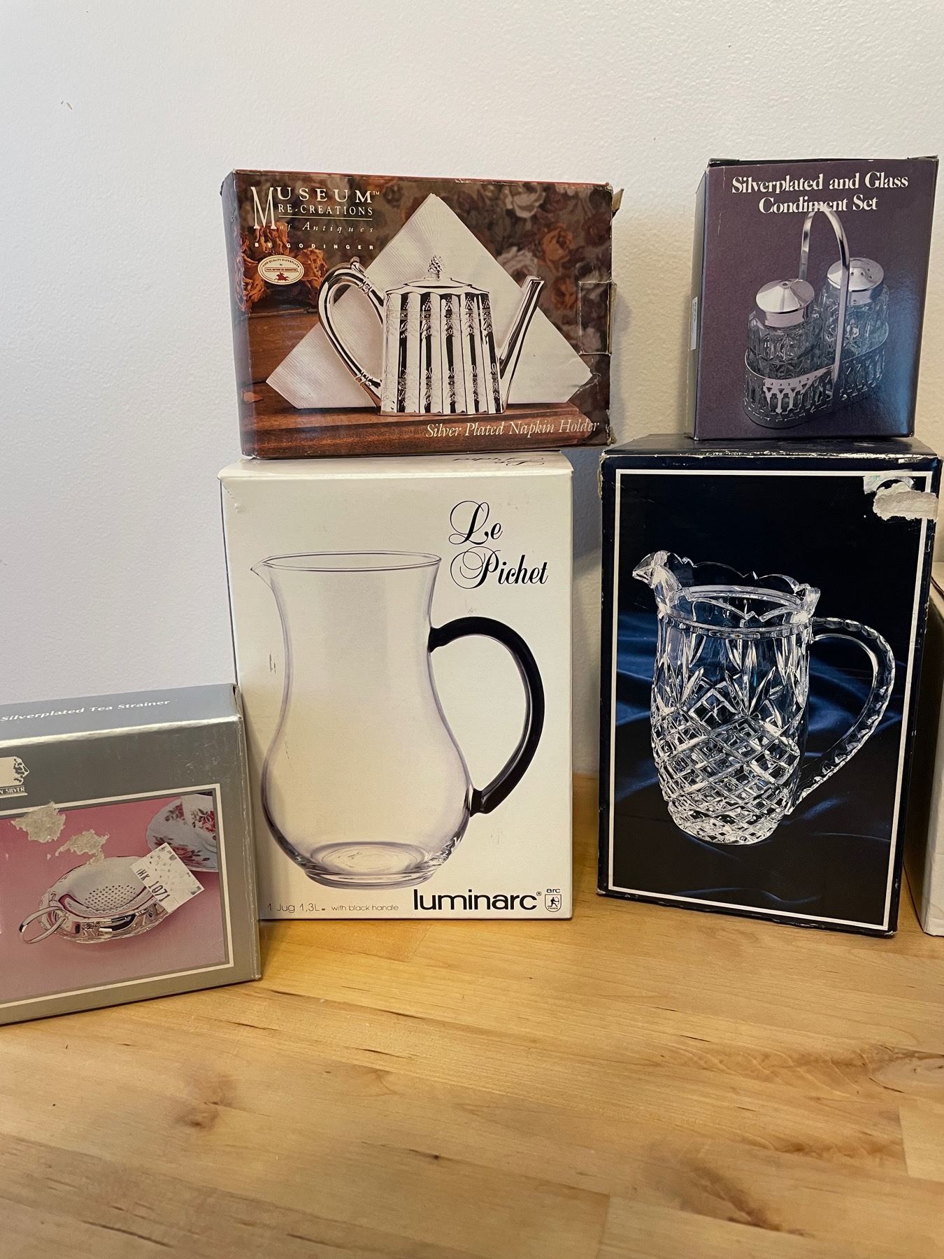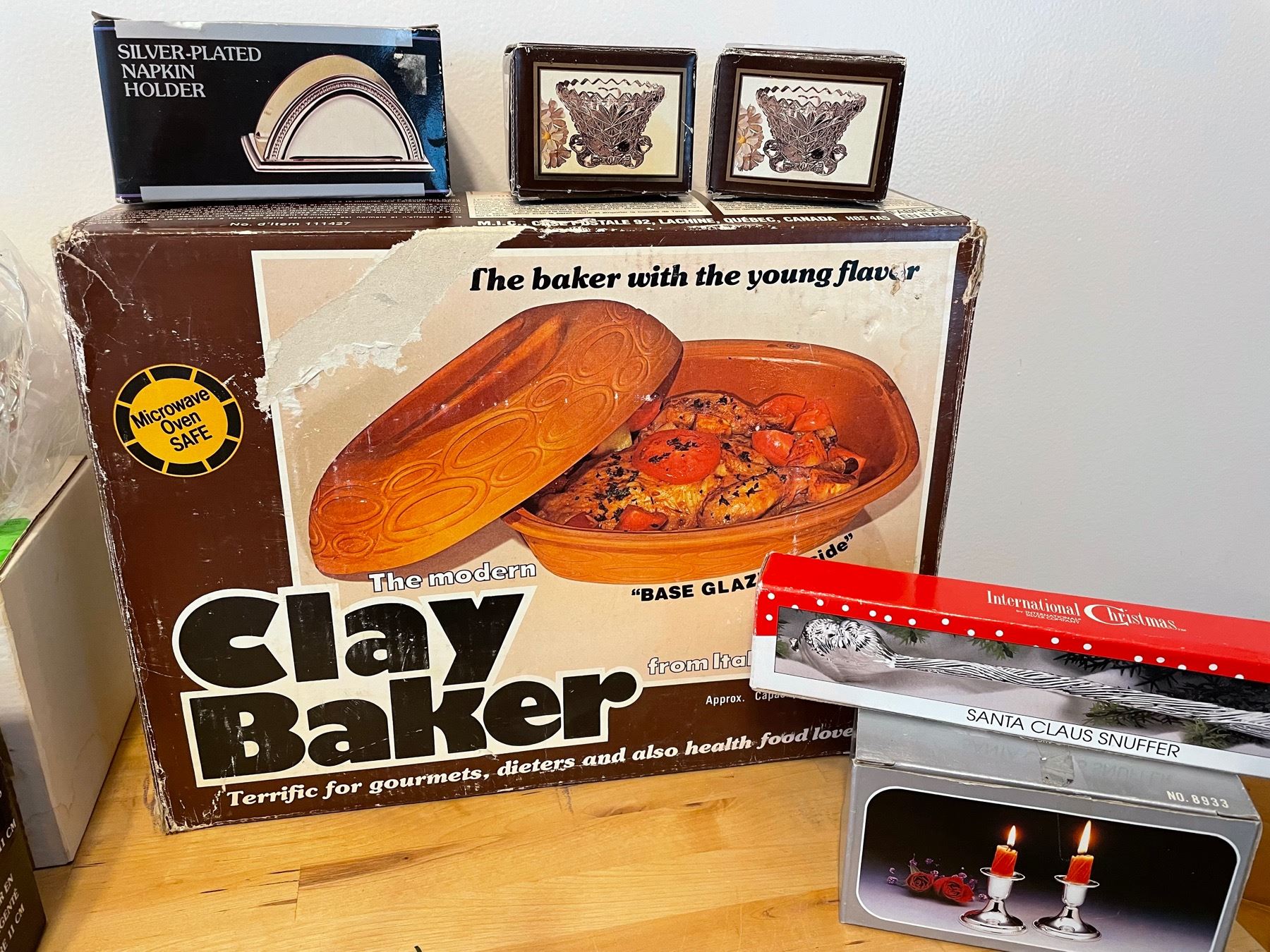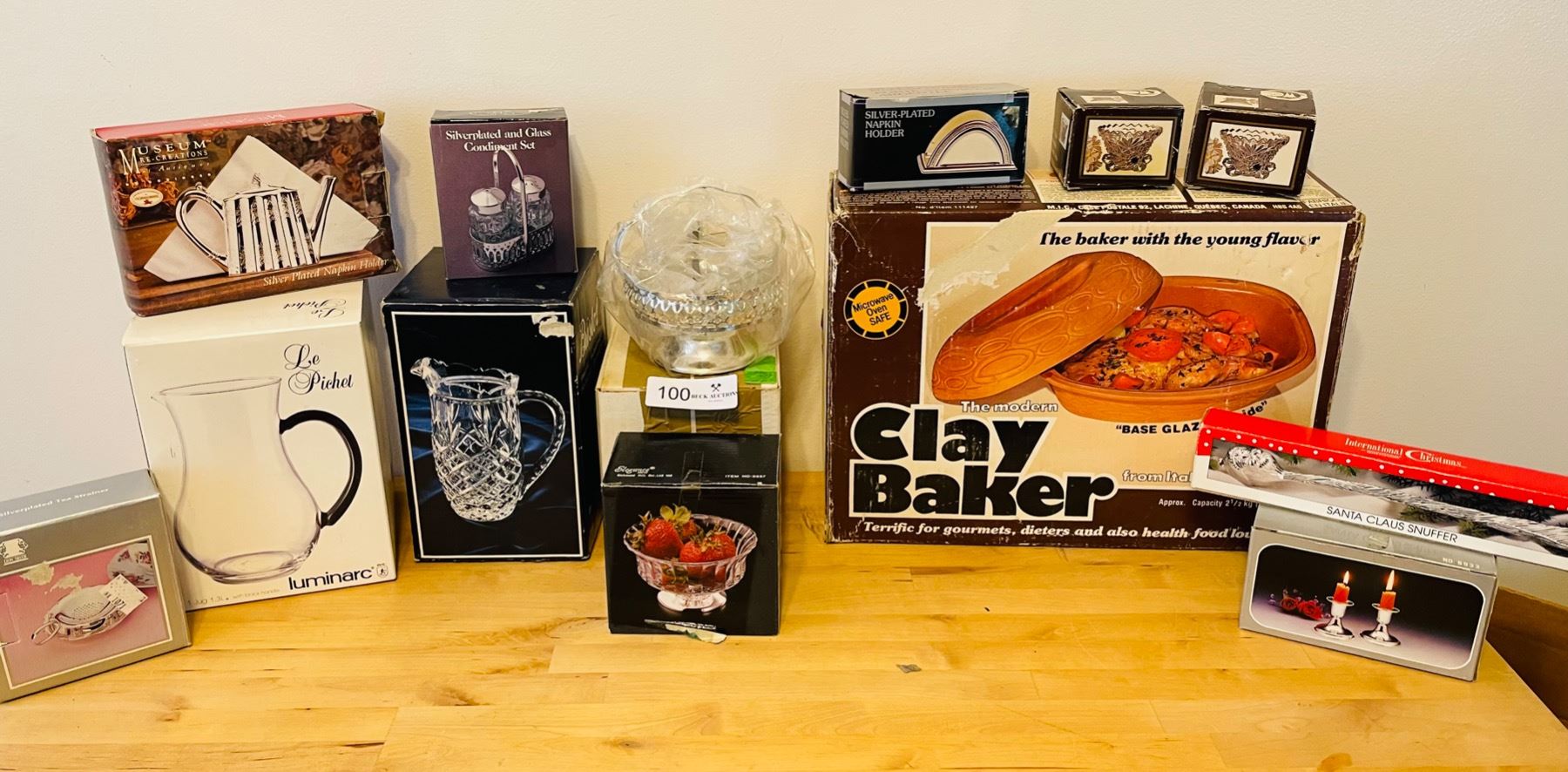 Vintage clay baking lidded dish, made in Italy never removed from box. Various other items either with original box or still new in box.