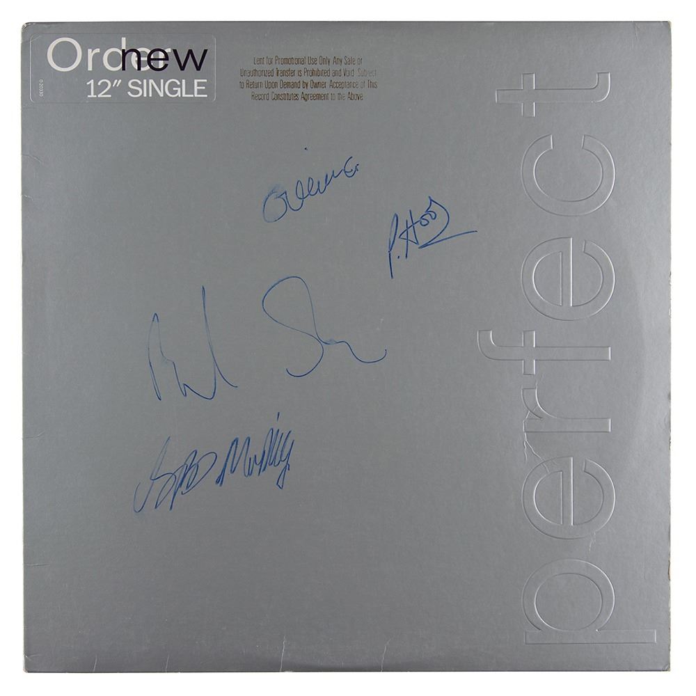 Desirable Qwest Records 12Àù promo single of 'The Perfect Kiss' by New Order, signed on the front of the sleeve in blue felt tip by Bernard Sumner, Peter Hook, Stephen Morris, and Gillian Gilbert. In fine condition, with a couple of trivial smudges. The record is included.