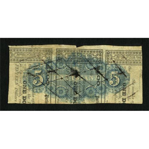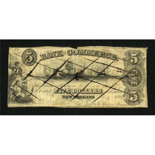 <B>New Orleans, LA- Bank of Commerce</B></I> $5 Feb. 21, 1862 G10b<BR> This <B>Fine </B></I>note is printed on the back of St. Charles Parish notes. It has been heavily pen cancelled and this in turn has produced some heavy ink erosion. The signatures are believed to be surreptitious. <BR><I>From The Collection of a Louisiana Gentleman</B></I><BR><BR><b>Shipping:</b> Coins & Currency (<a target="_blank" href="http://www.heritageauctions.com/common/shipping.php">view shipping information</a>)