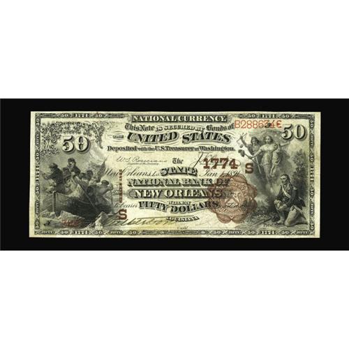 <B>New Orleans, LA</B></I> - $50 1882 Brown Back Fr. 512 <B>The State NB</B></I> Ch. # (S)1774<BR>One of the very nicest high denomination southern Brown Backs we have ever handled and an old friend as well, having been sold by us as lot 2333 of our June 1994 Memphis sale and off the market since that offering. This is a very scarce type in any grade and one which is very seldom seen from this region in this state of preservation. It is comparable, albeit a bit nicer, than the example we sold from here back in January of 2005 which realized $7200. <B>Extremely Fine+,</B></I> a premium piece fit for the finest of collections.