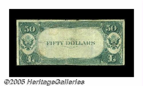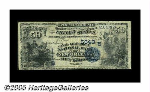 <B>New Orleans, LA</B></I> - $50 1882 Value Back Fr. 586 <B>Canal-Commercial NB</B></I> Ch. # (S)5649<BR>A recently discovered specimen of this excessively rare type, which was issued by only two banks in the entire country. The census now stands at seven pieces, including this example, three of which are impounded in institutional collections and hence unavailable to the collecting fraternity. Needless to say, any offering of this type is a major event, with appearances at public sale often measured in decades rather than years. Although the bottom margin is trimmed very slightly into the design, and there are a few tiny closed margin splits, this piece is otherwise defect free, and has retained a most pleasing appearance for its grade. Its offering here allows one more collector to join that very small group of individuals who can aspire to completing a complete set of U.S. currency by denomination and type. <B>Fine,</B></I> and certainly rare enough to easily exceed our likely quite conservative estimate of...