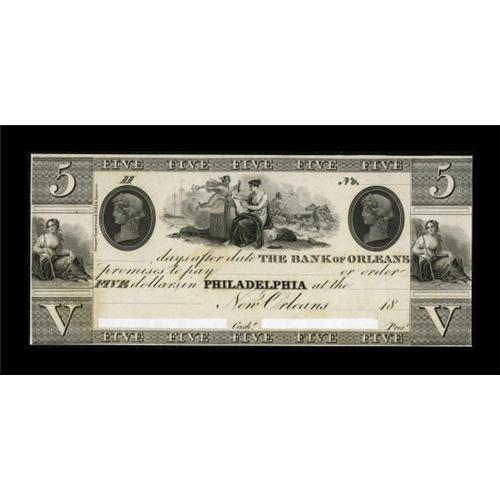 <B>New Orleans, LA- Bank of Orleans</B></I> $5 G72 Proof<BR> A rare Proof of a note payable in Philadelphia. <B>Uncirculated, </B></I>with the signature blocks cut out, mounted on a card. <BR><I>From The Collection of a Louisiana Gentleman.</B></I><BR><BR><b>Shipping:</b> Coins & Currency (<a target="_blank" href="http://www.heritageauctions.com/common/shipping.php">view shipping information</a>)