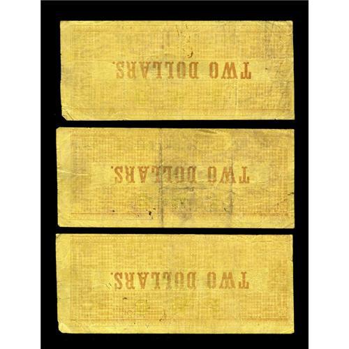 <B>New Orleans, LA- Cook & Brother</B></I> $2 March 15, 1862 UNL<BR>Here are three examples of this issue that carries the green two overprint and an inverted red reverse. <B>Fine.</B></I>
