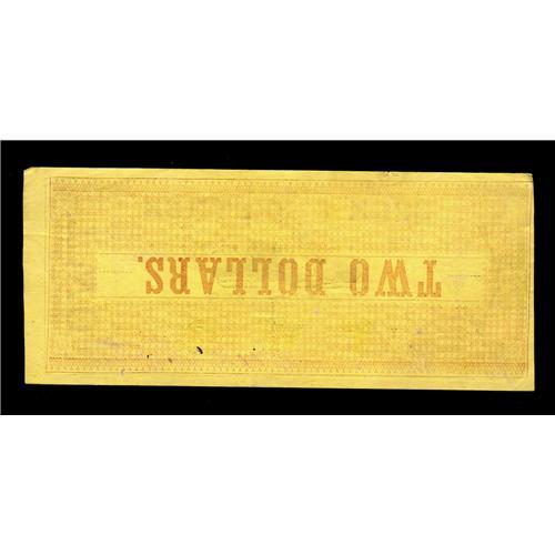 <B>New Orleans, LA- Cook & Brother</B></I> $2 March 15, 1862 UNL<BR>This pleasing example on yellow paper is well embossed and has three folds with some light wrinkles. <B>Extremely Fine.</B></I>