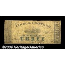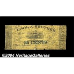 New Orleans, LA - Cook & Brother 25ó Dec. 14, 1862, $3 Jan. 1, 1862A scarce pair of wartime issues from this manufacturer of Confederate arms. Both are low grade, the 25ó Good with multiple repairs on the back and the $3 Very Good but backed, but both are rare any finer. 2 notes <BR><BR><B>Important notice:</B> Heritage usually auctions material at the rate of 200-250 lots per hour. On some occasions eBay Live bid software or the Internet may not be able to keep up with the pace of the auction. We recommend placing a realistic absentee bid now as insurance to avoid disappointment. Occasionally the auctioneer may eliminate or reject an eBay Live bid, and the auctioneer may also reopen a lot after the close of the eBay live bidding (usually because we missed an audience bid), and may reject your bid even if it shows you as the winning bidder. By bidding via eBay Live, you agree that Heritage may award the lot to another bidder at its sole discretion under the circumstances described above or any other reasonable circumstances. Since eBay bids are not shown to us until we open the lot on the floor, we treat those bids just like floor bids. In most cases the floor responds before the eBay bid is presented to us, due to Internet lag time, so for consistency we have made it a policy that floor bids are always considered first over tie eBay live bids. Also please note that all Heritage lots purchased through eBay Live carry a 20% Buyer's Premium. Please make sure you read the Terms and Conditions before you bid. <BR><BR><B>IMPORTANT ANNOUNCEMENT ABOUT RESERVES:</B> Heritage now divulges all reserves on its web site 7 days before every auction. If you want to know whether the reserve on this lot has been met, and if not, what the reserve amount is, please visit this lot page on the HeritageCoin.com web site, or email: bid@HeritageGalleries.com
