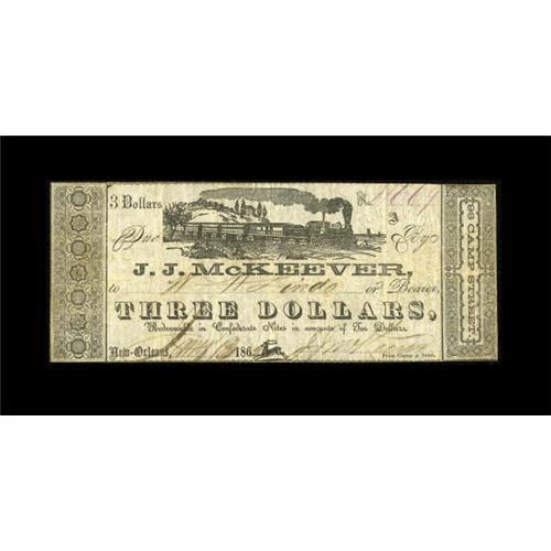 <B>New Orleans, LA- J.J. McKeever</B></I> $3 May 18, 1862<BR> A tough denomination from this scarce issuer. <B>Fine-Very Fine.</B></I><BR><I>From The Collection of a Louisiana Gentleman.</B></I><BR><BR><b>Shipping:</b> Coins & Currency (<a target="_blank" href="http://www.heritageauctions.com/common/shipping.php">view shipping information</a>)