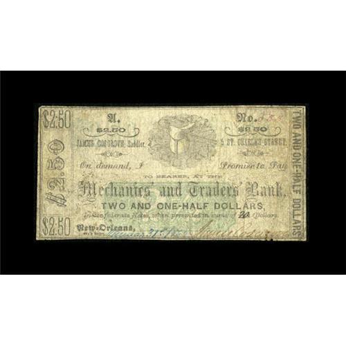 <B>New Orleans, LA- James Cosgrove</B></I> $2.50 Jan. 31, 1862<BR> A second piece from Mr. Cosgrove, this, unlike the $1 offered above, listing his occupation as "Saddler." <B>Fine,</B></I> with a back stamp authorizing the note listing his address as 108 Tchoupitoulas Street in New Orleans. <BR><I>From The Collection of a Louisiana Gentleman.</B></I><BR><BR><b>Shipping:</b> Coins & Currency (<a target="_blank" href="http://www.heritageauctions.com/common/shipping.php">view shipping information</a>)