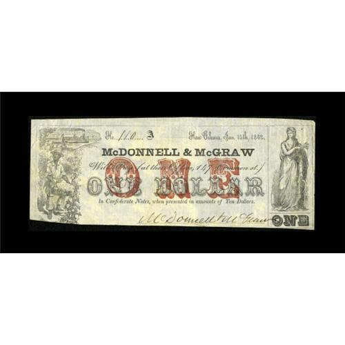 <B>New Orleans, LA- McDonnell & McGraw</B></I> $1 Jan. 15, 1862<BR> A very scarce item. Pleasing <B>Very Fine,</B></I> with a few hinge remnants on the back and a trimmed in left bottom margin. <BR><I>From The Collection of a Louisiana Gentleman.</B></I><BR><BR><b>Shipping:</b> Coins & Currency (<a target="_blank" href="http://www.heritageauctions.com/common/shipping.php">view shipping information</a>)