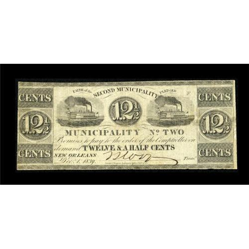 <B>New Orleans, LA- Municipality No. 1</B></I> 12 1/2¢ Dec. 1, 1839<BR> A rare fractional denomination. <B>Fine-Very Fine.</B></I><BR><I>From The Collection of a Louisiana Gentleman.</B></I><BR><BR><b>Shipping:</b> Coins & Currency (<a target="_blank" href="http://www.heritageauctions.com/common/shipping.php">view shipping information</a>)