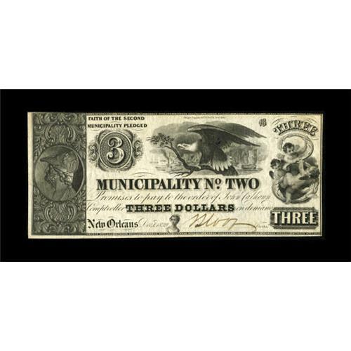 <B>New Orleans, LA- Municipality No. 2</B></I> $3 Dec. 1, 1839<BR> A nice example of this better denomination. <B>Very Fine.</B></I><BR><I>From The Collection of a Louisiana Gentleman.</B></I><BR><BR><b>Shipping:</b> Coins & Currency (<a target="_blank" href="http://www.heritageauctions.com/common/shipping.php">view shipping information</a>)