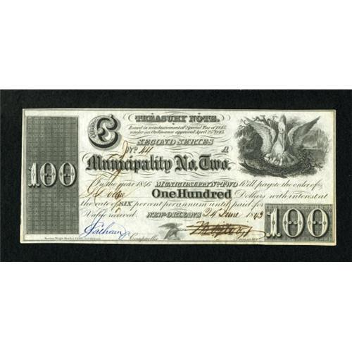 <B>New Orleans, LA- Municipality No. Two </B></I>$100 June 24, 1843 <BR> The paper on this $100 is as fresh as one will find for the issue. Nary a problem can be seen. <B>Very Fine.</B></I><BR><I>From The Collection of a Louisiana Gentleman</B></I><BR><BR><b>Shipping:</b> Coins & Currency (<a target="_blank" href="http://www.heritageauctions.com/common/shipping.php">view shipping information</a>)