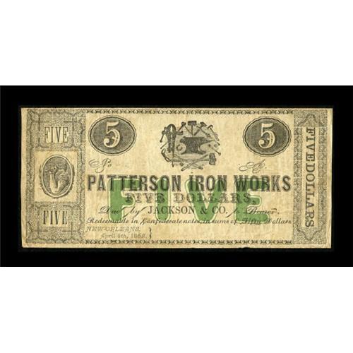 <B>New Orleans, LA- Patterson Iron Works</B></I> $5 April 5, 1862<BR> A nice grade example bearing a sharp green overprint. <B>Fine-Very Fine.</B></I><BR><I>From The Collection of a Louisiana Gentleman.</B></I><BR><BR><b>Shipping:</b> Coins & Currency (<a target="_blank" href="http://www.heritageauctions.com/common/shipping.php">view shipping information</a>)