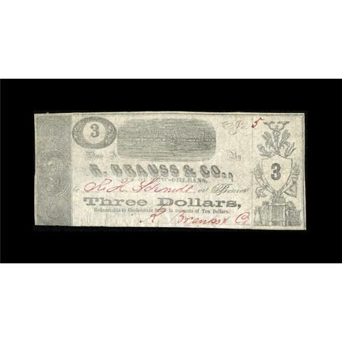<B>New Orleans, LA- R. Brauss & Co.</B></I> $3 <BR> An undated but obviously Civil War era scrip item from what clearly is a very scarce issuer. <B>Fine-Very Fine. </B></I><BR><I>From The Collection of a Louisiana Gentleman.</B></I><BR><BR><b>Shipping:</b> Coins & Currency (<a target="_blank" href="http://www.heritageauctions.com/common/shipping.php">view shipping information</a>)