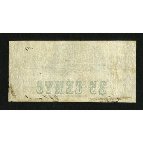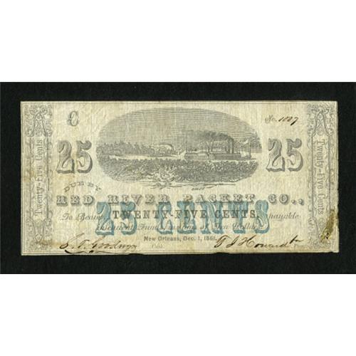 <B>New Orleans, LA- Red River Packet Co. </B></I>25c Dec. 1, 1861<BR> We have yet to offer this merchants 25c denomination at auction. The piece features a river boat vignette at center and a bold blue "25 CENTS" overprint. <B>Fine,</B></I> with some ink burn on the signatures.<BR><I>From The Collection of a Louisiana Gentleman</B></I><BR><BR><b>Shipping:</b> Coins & Currency (<a target="_blank" href="http://www.heritageauctions.com/common/shipping.php">view shipping information</a>)